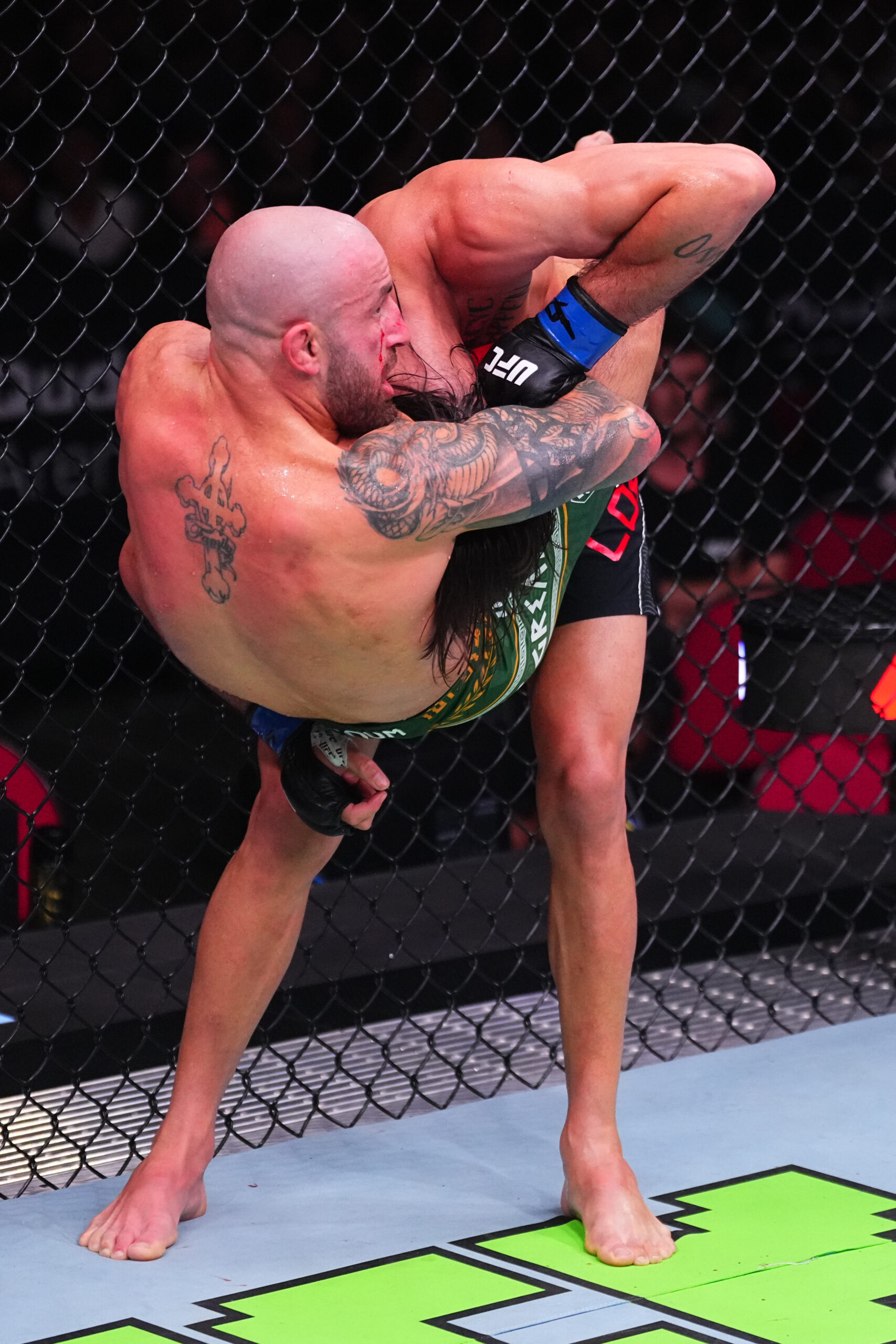 More thunderous applause for the hometown hero inside Qudos Bank Arena (by B.H.’s scorecard, Volk was comfortably leading at this stage). The two featherweights reverted to a familiar rhythm of lengthier challenger pivoting at the Octagon’s centre and the stout champion circling from the outside. A lion sizing up his prey or struggling to close in? Volk found a home for several crosses – interspersed with several takedown attempts – that Lopes valiantly chinned and brazenly asked for more of. Volk slipped to a knee, causing the entire stadium to gasp and clench, bookending the round.