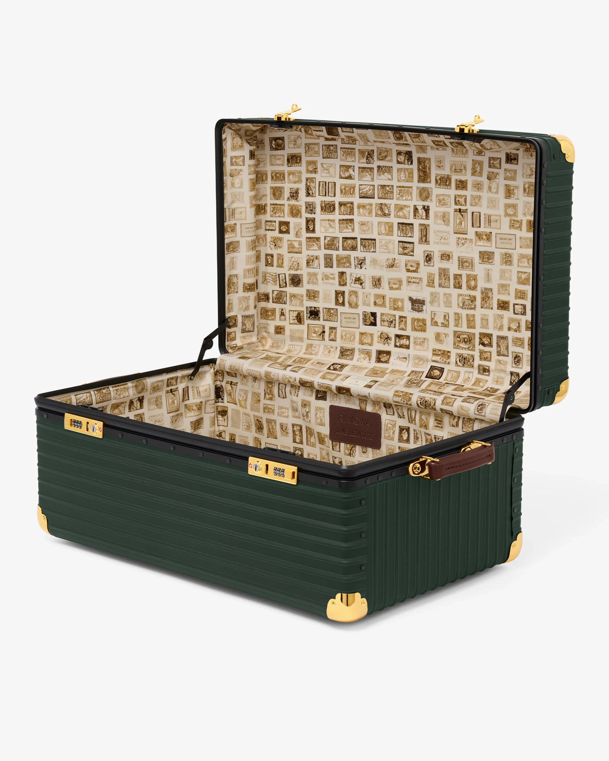 The collection features two standouts: the RIMOWA x Aimé Leon Dore Chest ($5,690) and the RIMOWA x Aimé Leon Dore Cabin ($3,920). Handcrafted in Germany, these items showcase Aimé Leon Dore’s signature green hue, while the gold-tone hardware and brown leather handle bring a feeling of vintage-inspired warmth to the table — perfect when strapped to the roof of your similarly tricked-out Porsche 944 Turbo.