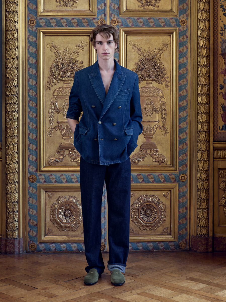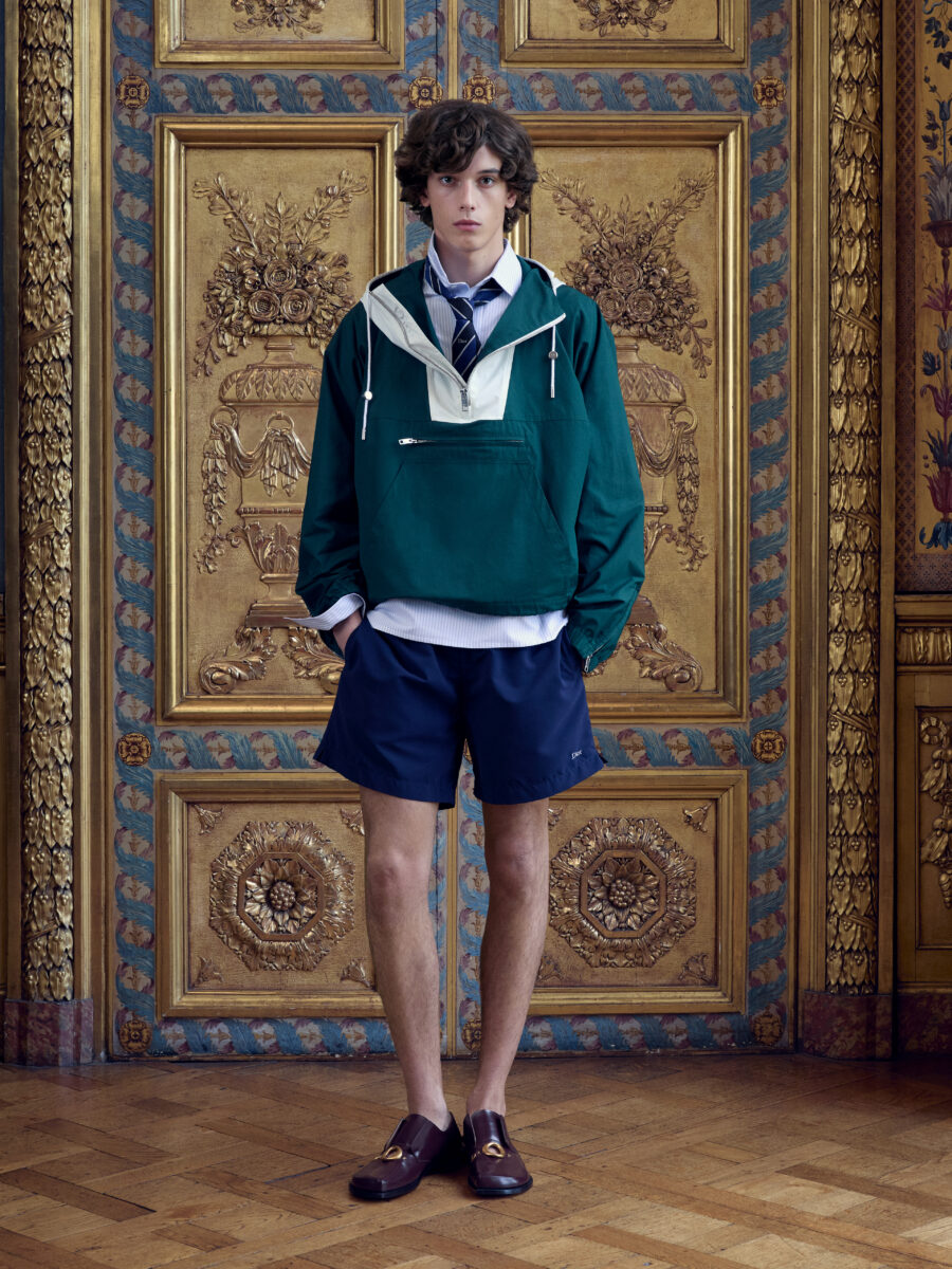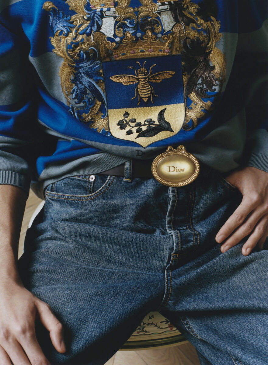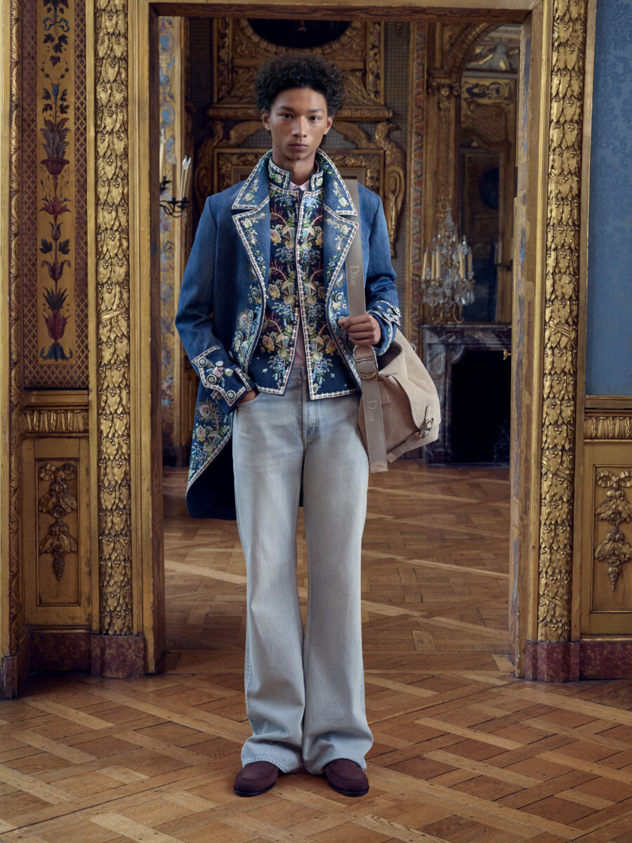 Anderson couldn’t resist, however, the firmer nod to heritage. The Bar jacket is the rite of passage for any Dior creative director. Here, Anderson made it male. Other ties to Mr. Dior surfaceโ a denim tailcoat, Napoleon III chair motifs, heraldic symbolism and voluminous Delft shorts all echoing Dior’s deep reverence of 18th Century and Medieval French design. Dior was also fond of British fabrication, so Donegal tweed shows up across the collection.
