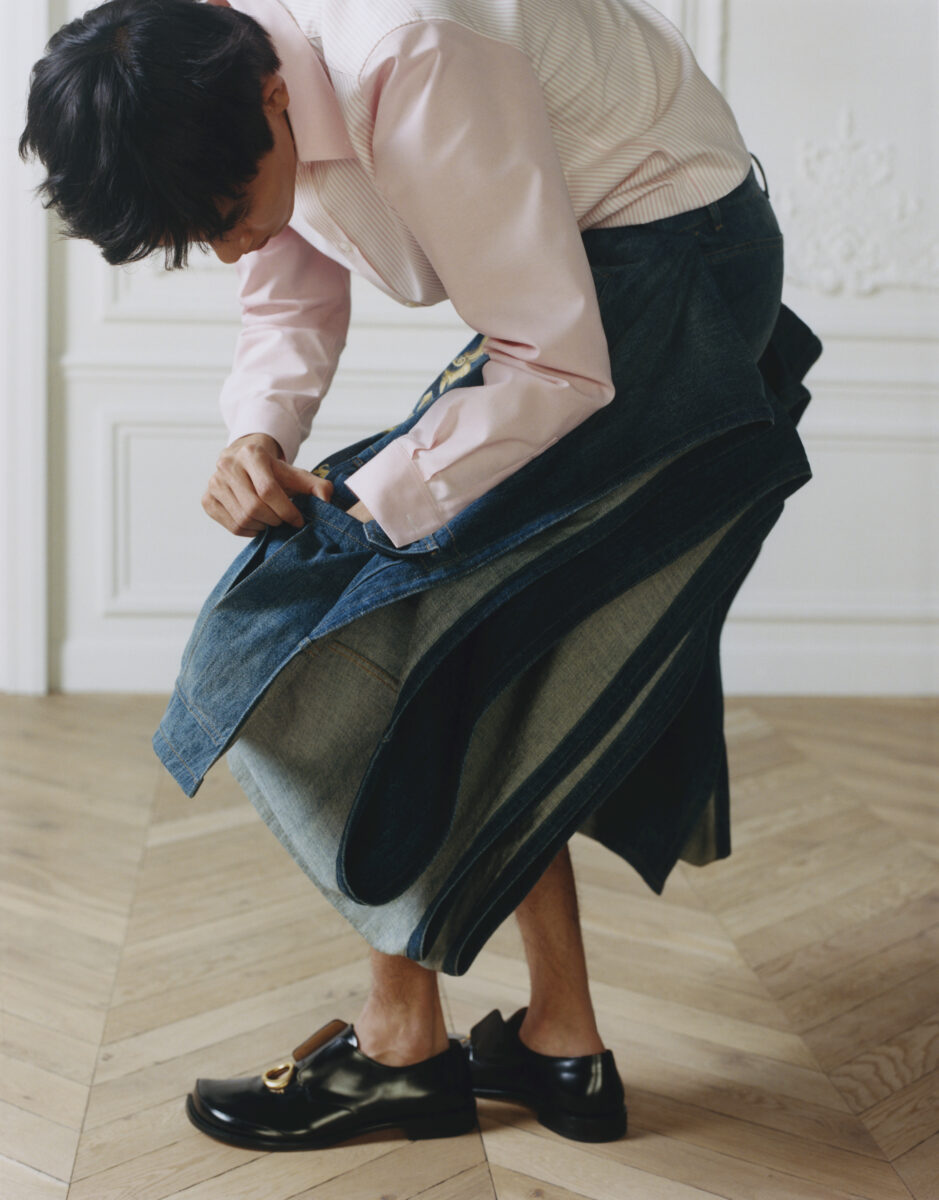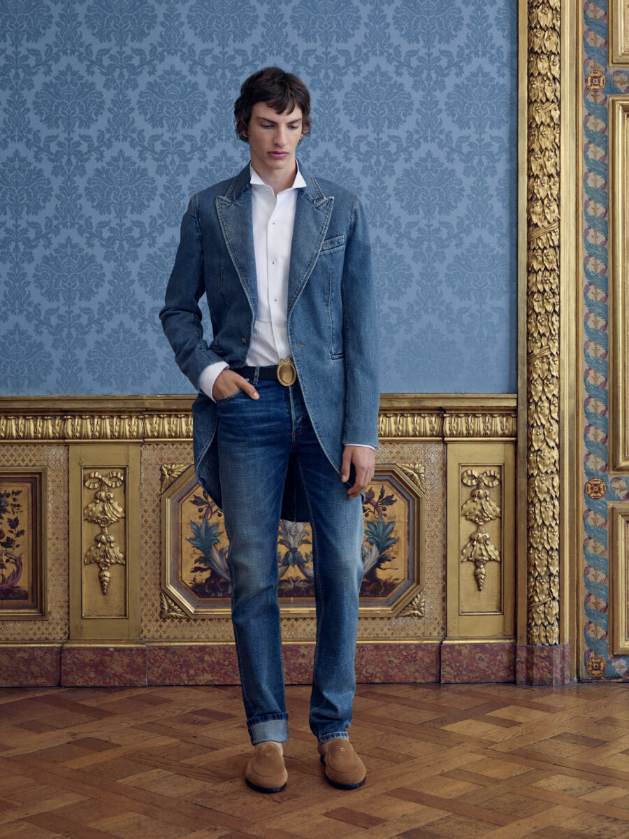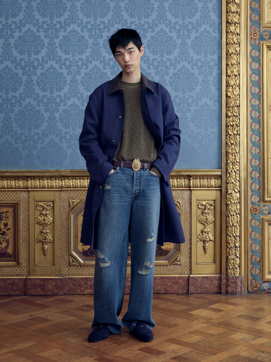 Anderson couldn’t resist, however, the firmer nod to heritage. The Bar jacket is the rite of passage for any Dior creative director. Here, Anderson made it male. Other ties to Mr. Dior surfaceโ a denim tailcoat, Napoleon III chair motifs, heraldic symbolism and voluminous Delft shorts all echoing Dior’s deep reverence of 18th Century and Medieval French design. Dior was also fond of British fabrication, so Donegal tweed shows up across the collection.