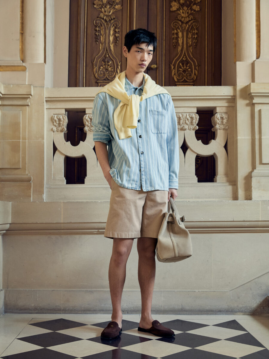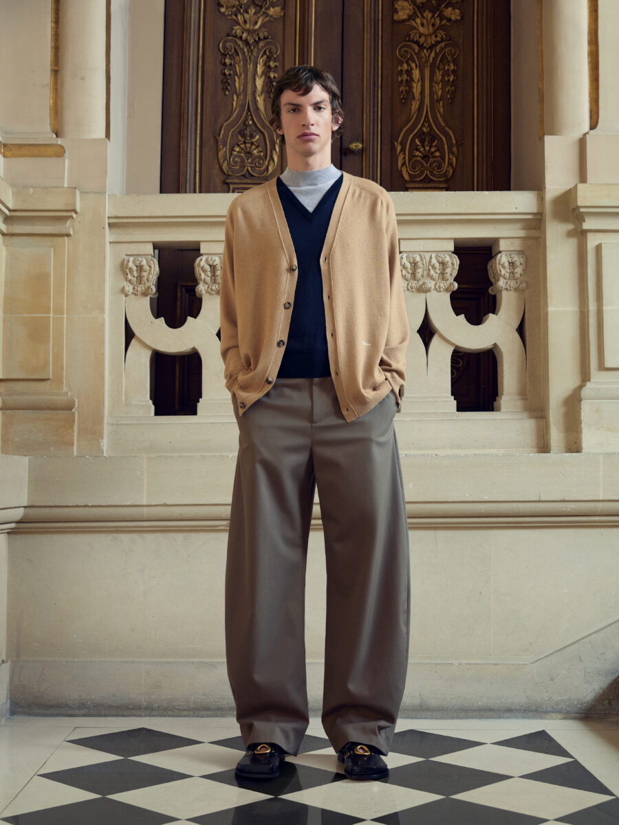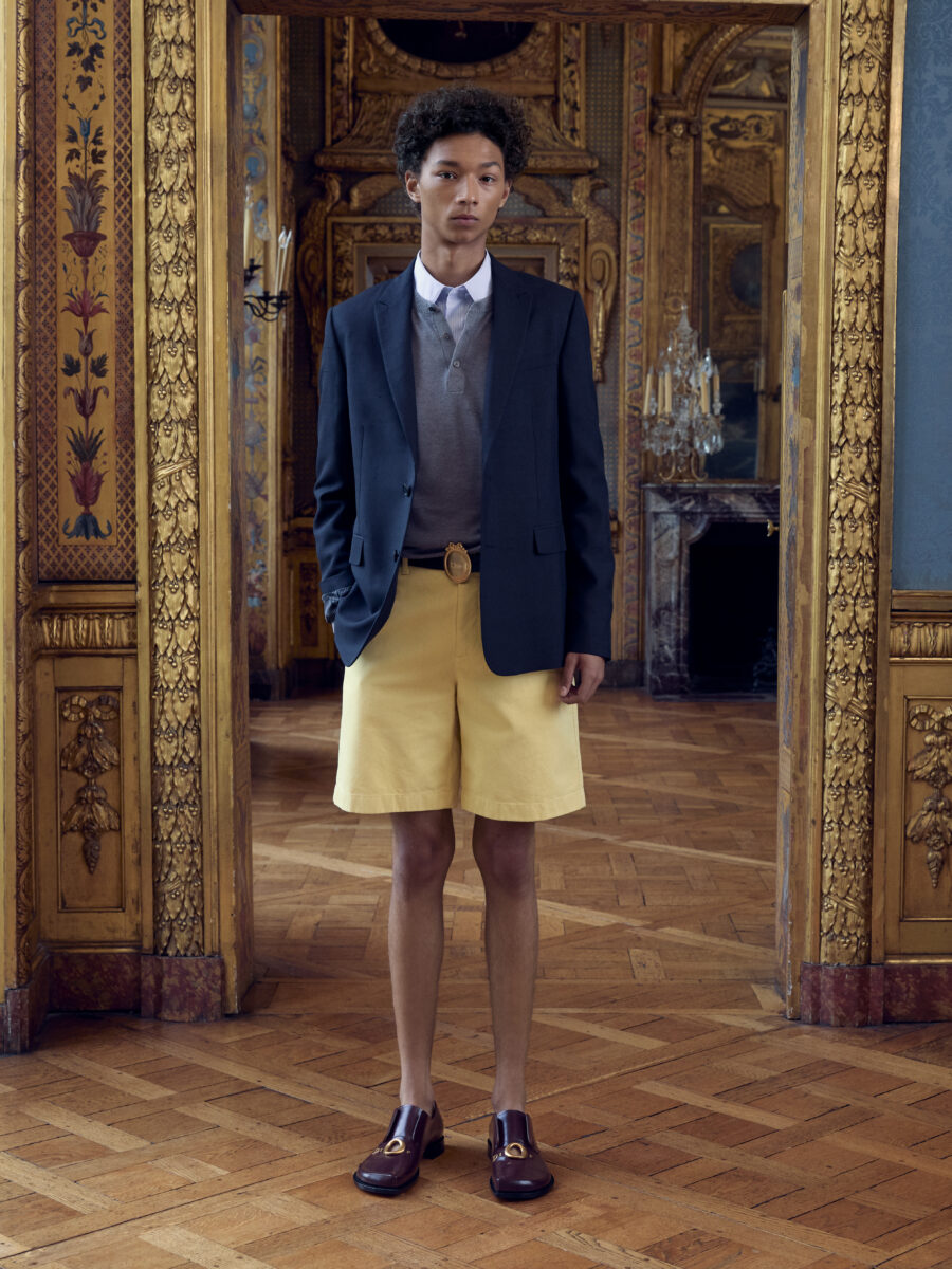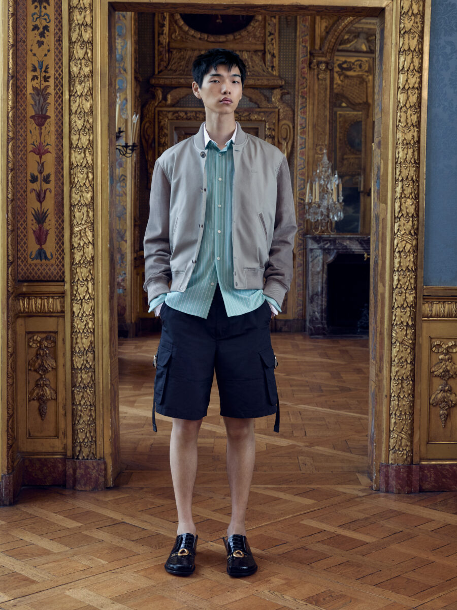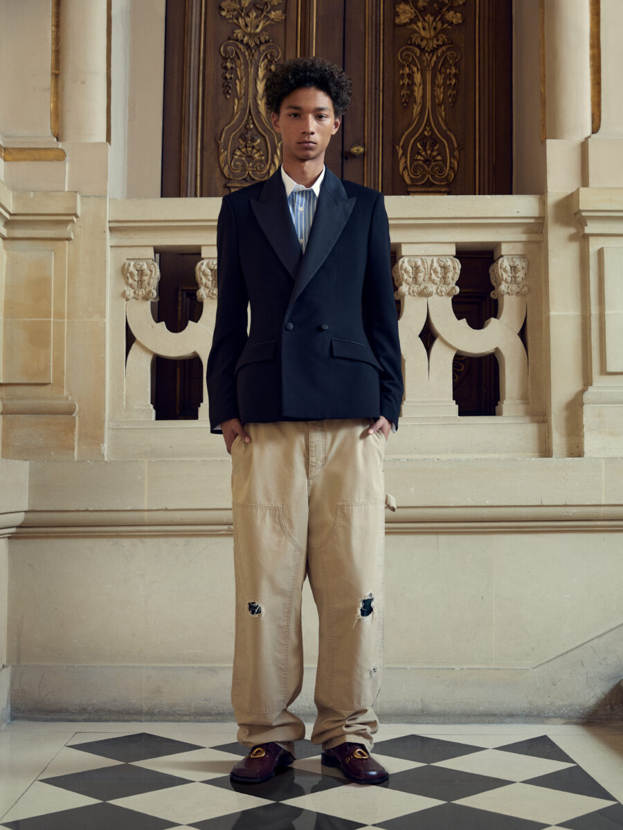 The standout pieces aren’t the loudest โ the real talent is in how wearable the collection is. A dress shirt with striped-tie button placket, roomy Carpenter Jeans, Tuxedo-style Bar Jacket (also in Tweed), rose-red Chino Shorts, silk ties, and cutout Derbies. They are situational by design.