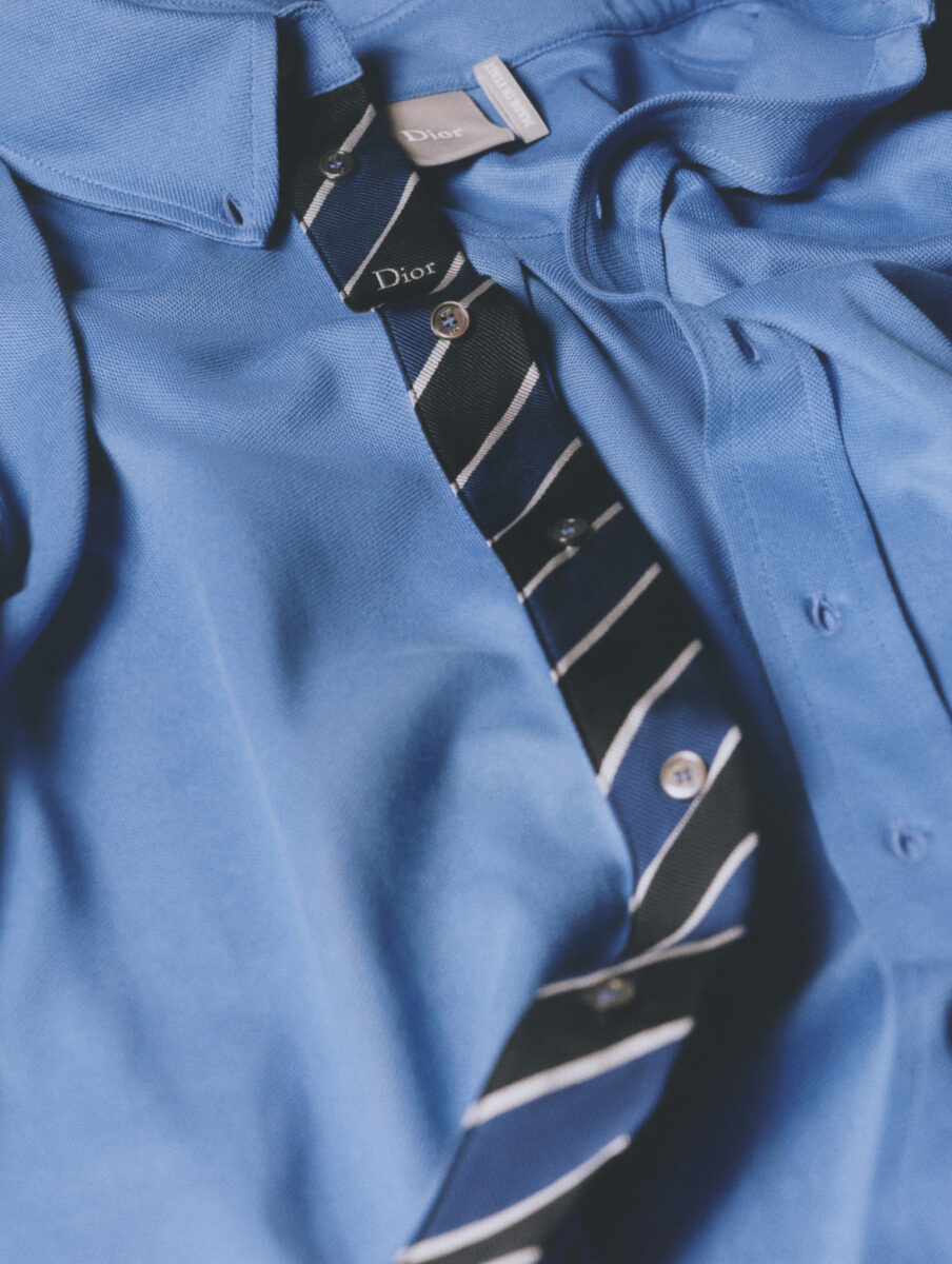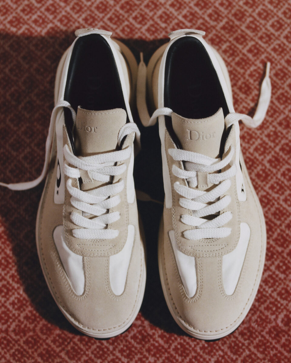 The Dior Squash sneaker is equally layered. A refined reinterpretation of the classic running shoe โ built in nylon and suede, with a sculpted tread that gives it athletic conviction without athletic casualness. It works harder than it looks: worn with the tailored pieces in this collection, it refuses to let the outfit become precious. Available in black, cream, blue, or a two-tone version, it’s a shoe for the man who goes from a board meeting to a restaurant without going home first.
