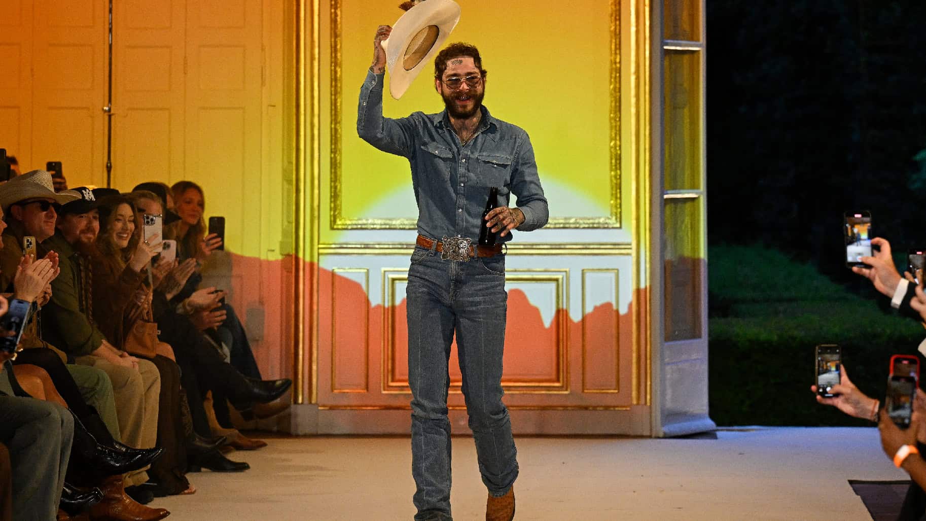 Post Maloneโs At First Light runway show reached a climax with an unnamed Rip Wheeler-esque stoic modelling a Yellowstone look on an actual horse.