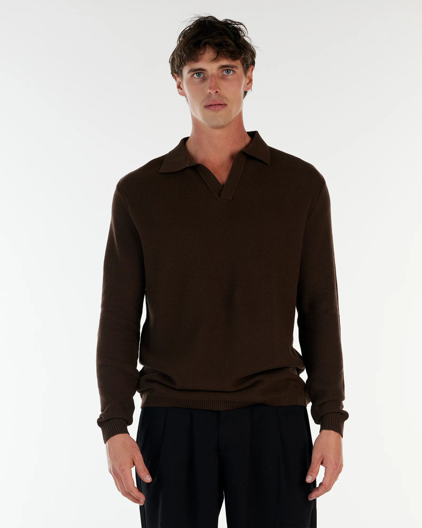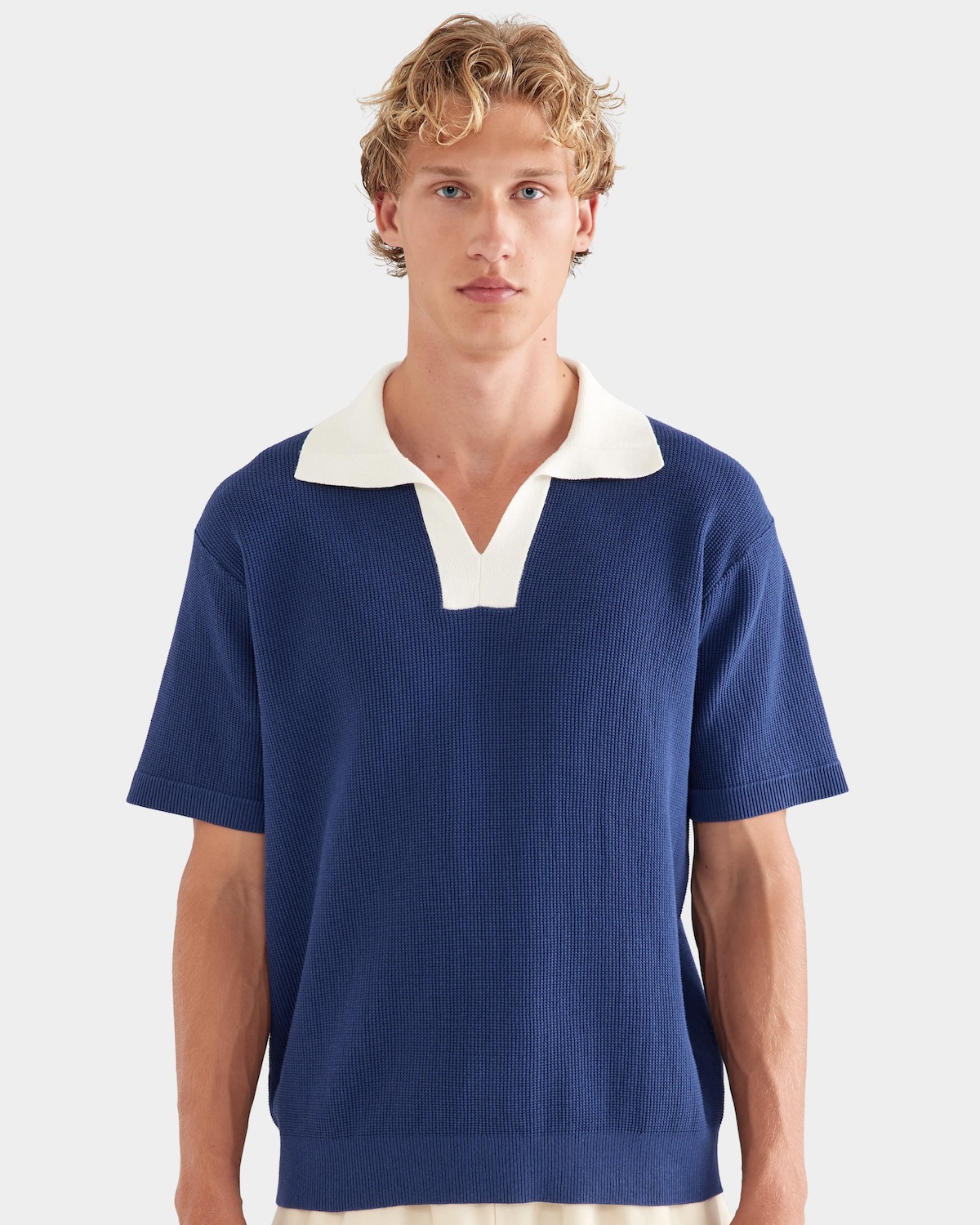 Designs like the Huxley knitted polo exemplify why. Made using 94% organic cotton, this shirt features an open weave that looks best layered over a singlet and makes it perfect for a day at the beach.