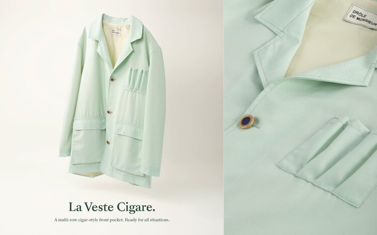 Today’s garment in question is a light sea green Cigare Jacket made of Portuguese fabric with a washed look.