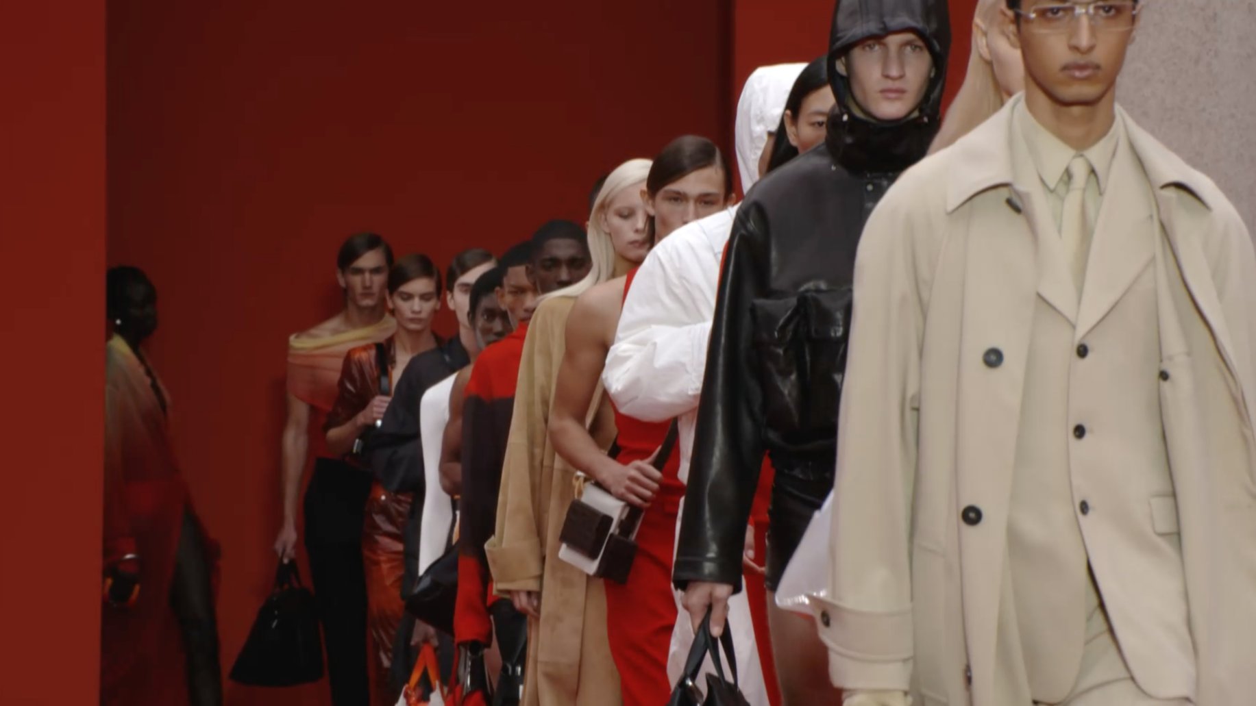 On the menโs side, Co-Creative-Director Raf Simons has crafted a wardrobe that sidesteps almost all the overcooked maximalism that appears to be gripping the wider industry. Instead, through repeated interrogation of democratic styles of clothing โ think denim, the humble trail sneaker โ Simons successfully augments the message etched in Koolhaasโs surroundings.