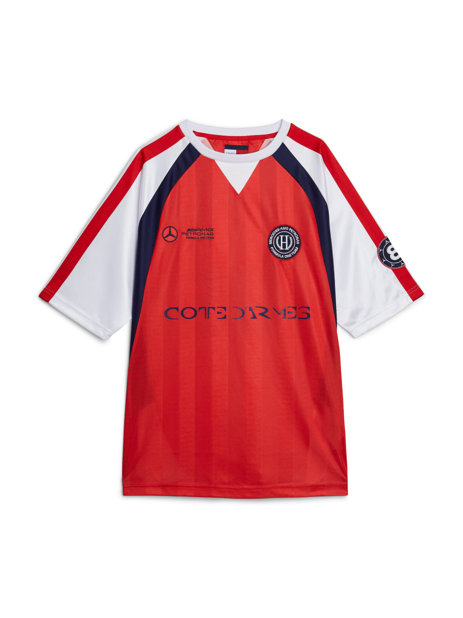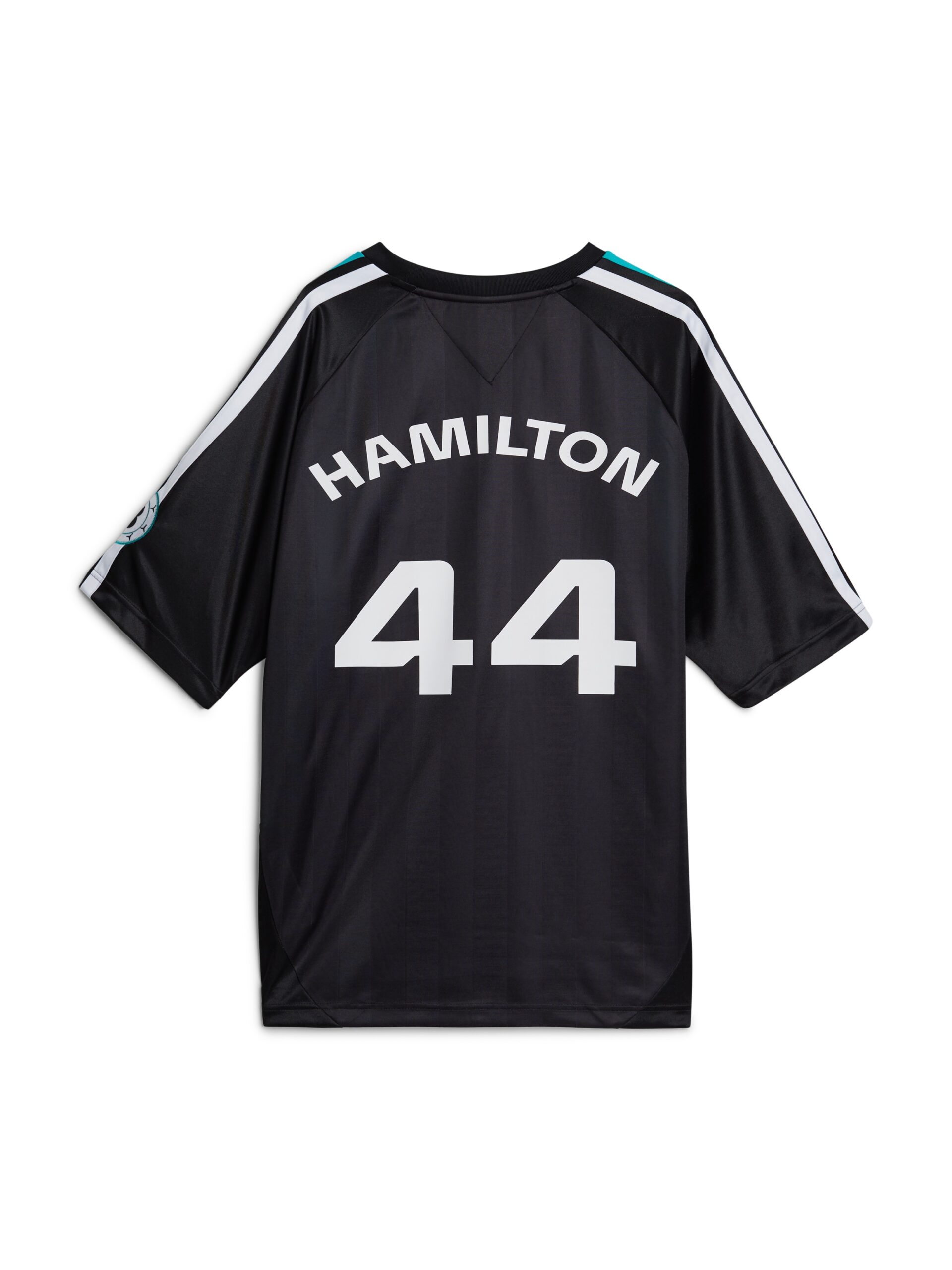 This innovative 10-piece capsule, which has simultaneously been infused with heritage and โthe future,โ entails pieces ranging from colour-blocked varsity jackets ($999); to embroidered chino pants ($349) and football jerseys ($249) featuring the seven-time world champion and his teammateโs racing numbers.