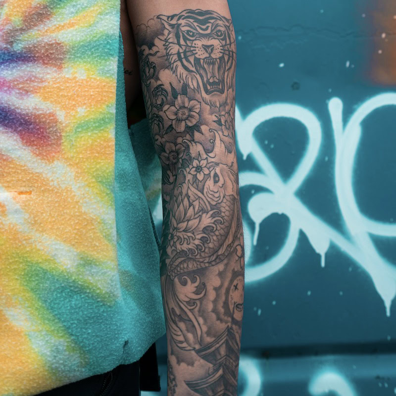 Full-sleeve tattoos transform your arm into a mural that tells a story, usually with thematically similar tattoo designs or an entire scene.