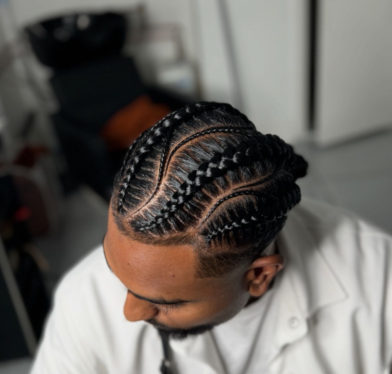 This one takes some time to style, as you will need to make plaits first and then secure them with braid rings. You also need to ensure that no loose hair is hanging over your face. Additionally, there is a need for a particularly short cut at the back of your head because the shaved sides add to the lookโs sharpness.