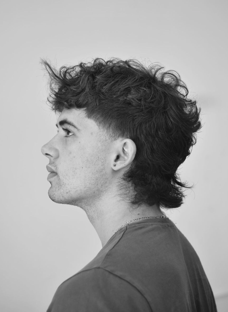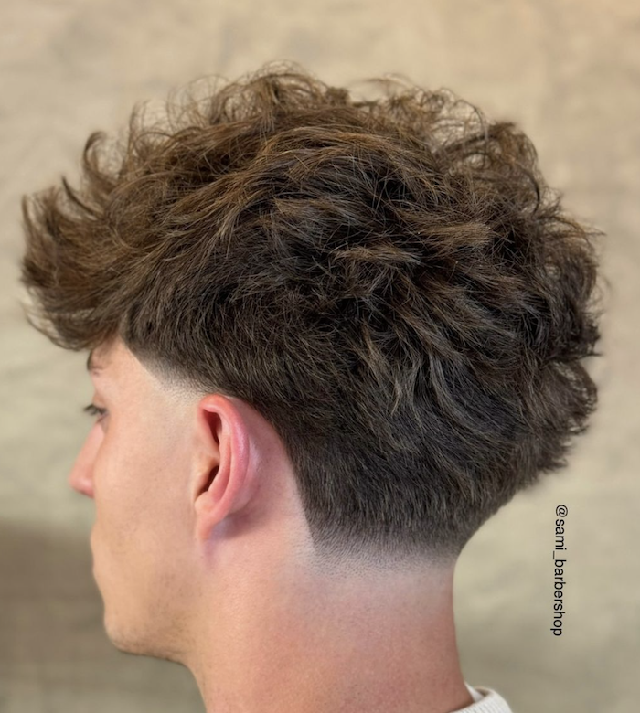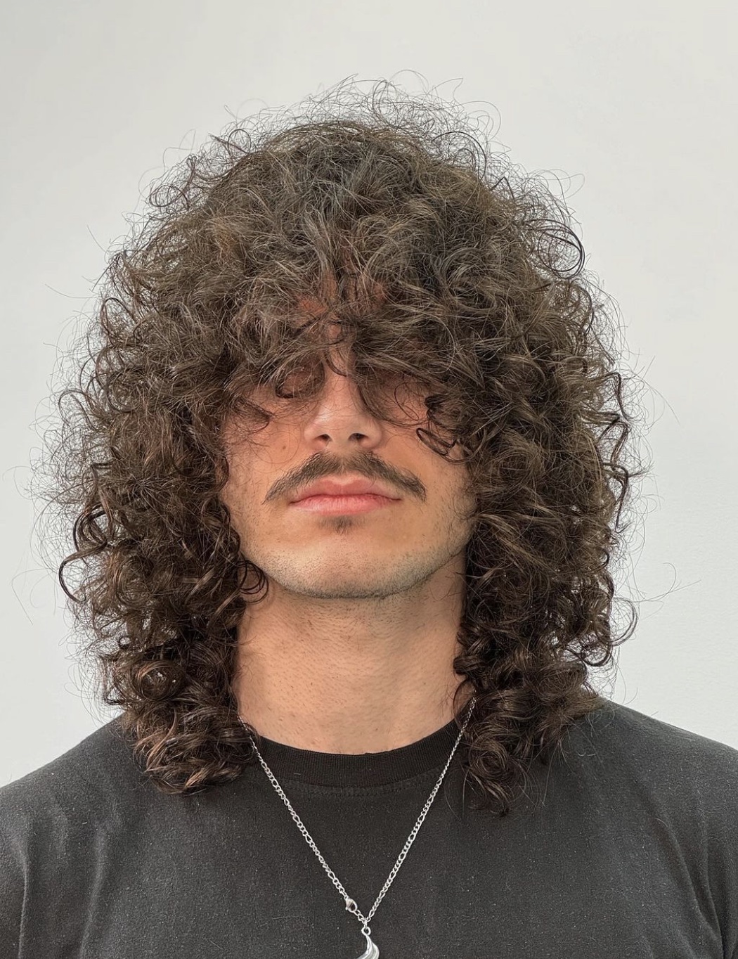 This style features a classic mullet haircut with curly hair. Itโs a bold look with shorter hair on the front and sides that leaves longer curls at the back.