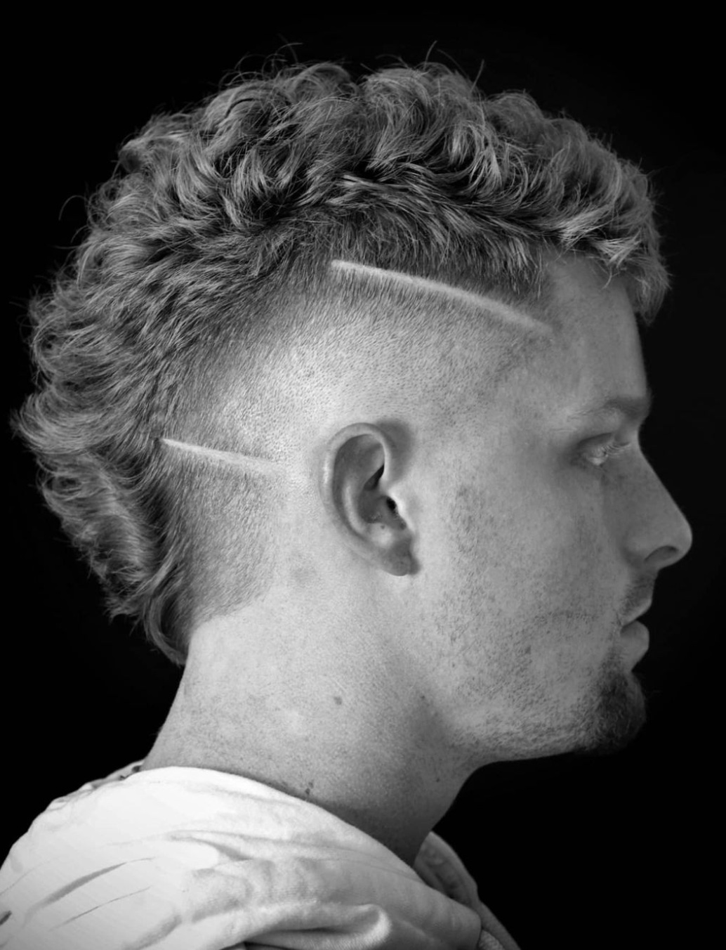 If youโre feeling a little bold, you can enjoy your curly hair up top with a buzz-cut style and complex designs on the sides. This cut is edgy and artistic, with carefully crafted designs on the buzzed areas.