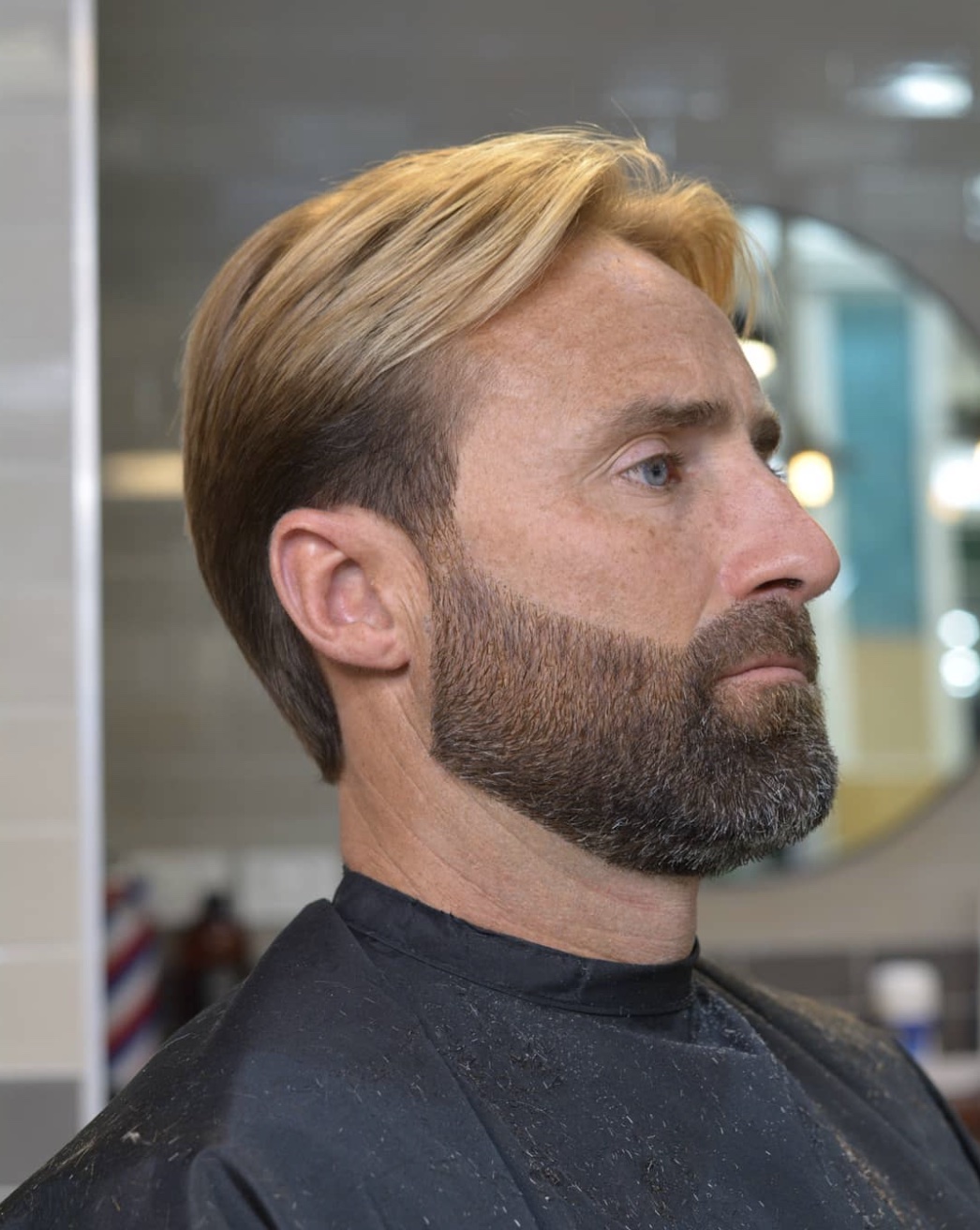 To achieve this look, you simply part your hair to the side and comb the hair to cover the crown of the head. You can fade the exposed side or keep the hair mid-length and comb it in the opposite direction. Then, apply a small amount of styling cream to harden it and keep everything in its place. A long comb-over suits men with both thick and thinning hair, and is a great long hair low maintenance look.