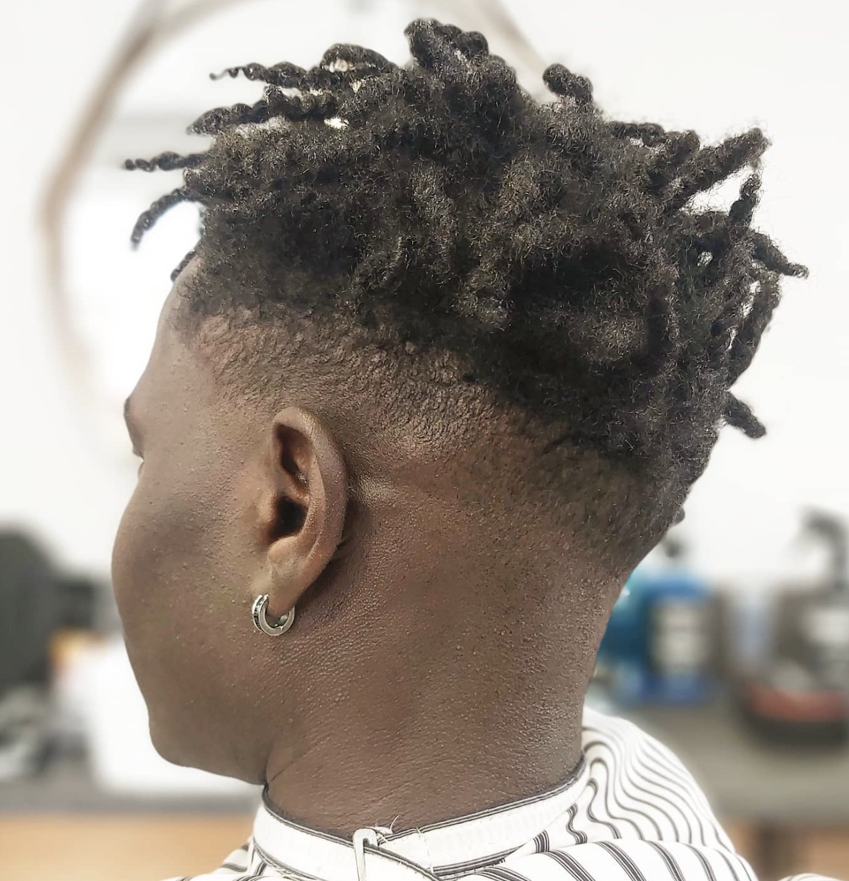 The top layer of hair is wrapped into dreadlocks or braided into cornrows. This fashion-forward look suits men with tight curls and coarse hair.