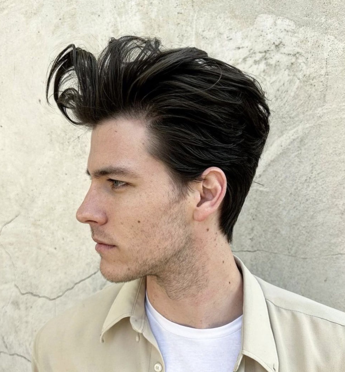 The pompadour is a trendy and classic medium-length hairstyle that suits men with curly hair or straight hair. This iconic look, worn by James Dean and Elvis Presley, elongates the forehead by creating a dome of hair at the top of the head.