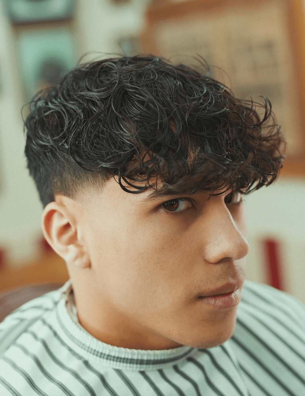 The fringe falls over the forehead with a blunt cut edge for a clean and professional look that highlights the hairโs natural texture. Whether you have thicker hair or natural curls, the mid-length hairstyle with fringe is a great option for anyone looking for an easy menโs haircut.