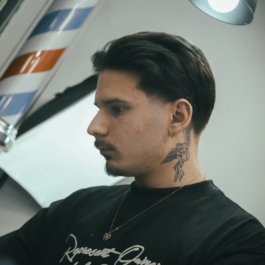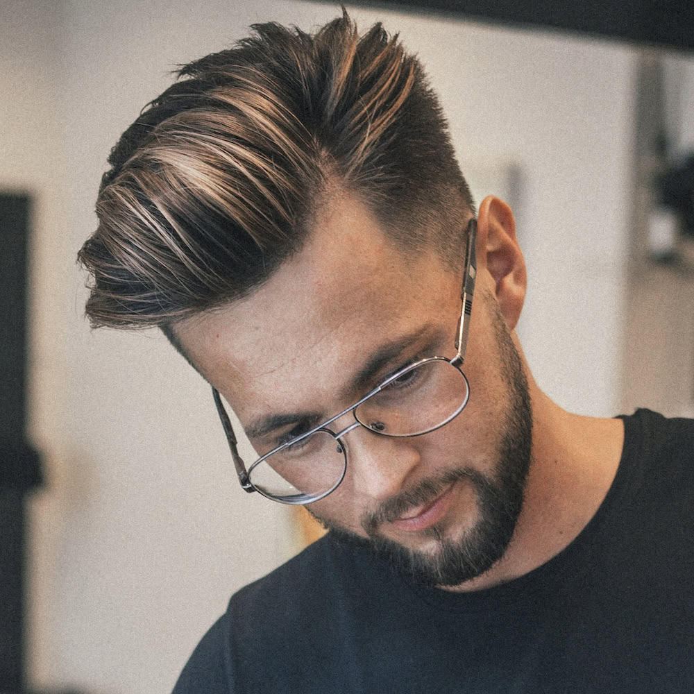A casual run-through of the fingers with some product should do the trick; tapered sides are essential, especially if you’re playing around with blending facial hair with your short haircut.