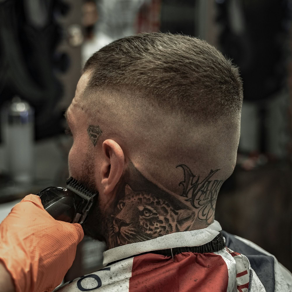 If you’re stuck on the decision, note that a low fade just tapers hair down the shortest around the hairline, a mid fade instead goes shorter a few inches higher, and a high fade typically follows an imaginary line from the corner of the forehead around the head.
