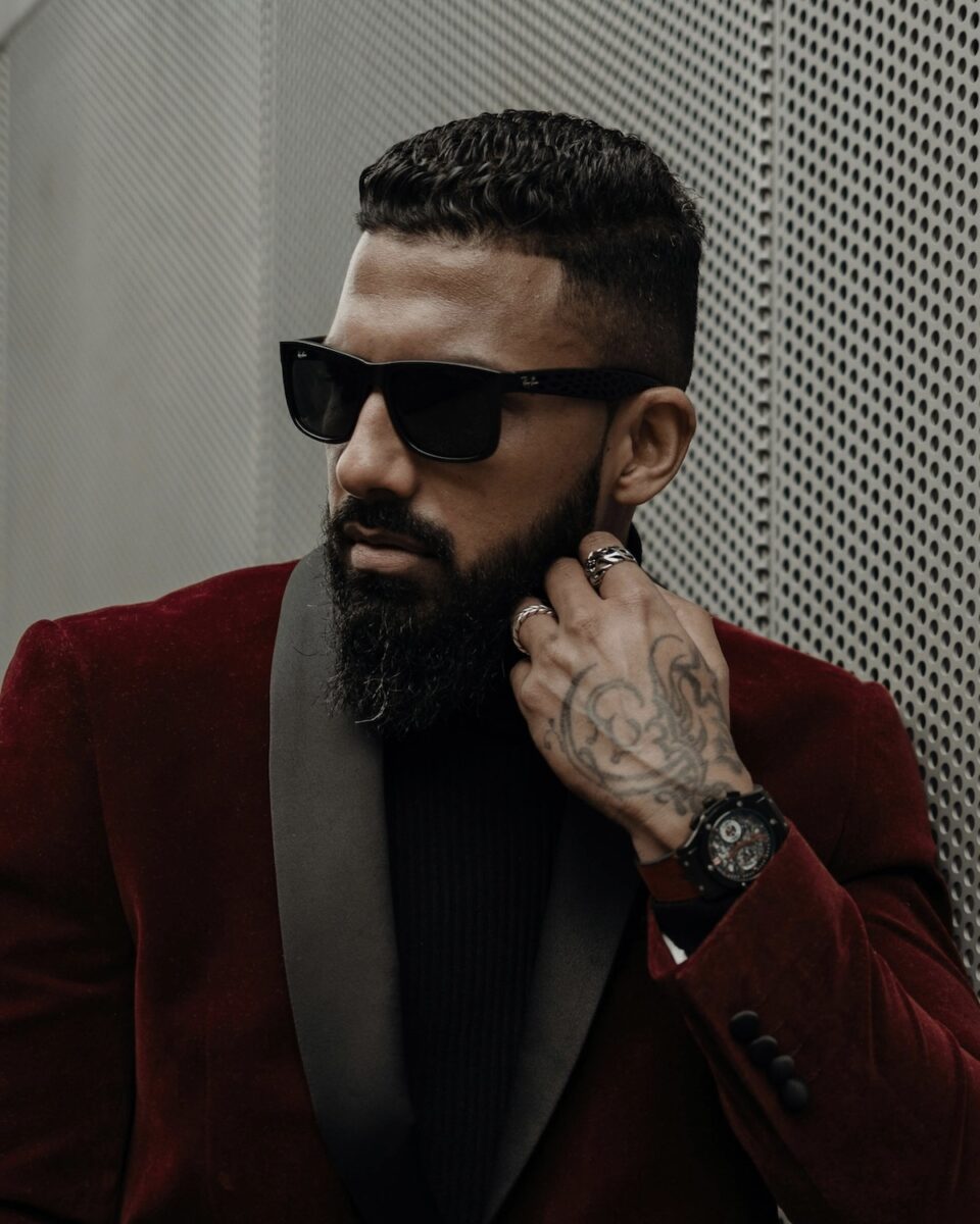 A casual run-through of the fingers with some product should do the trick; tapered sides are essential, especially if you’re playing around with blending facial hair with your short haircut.