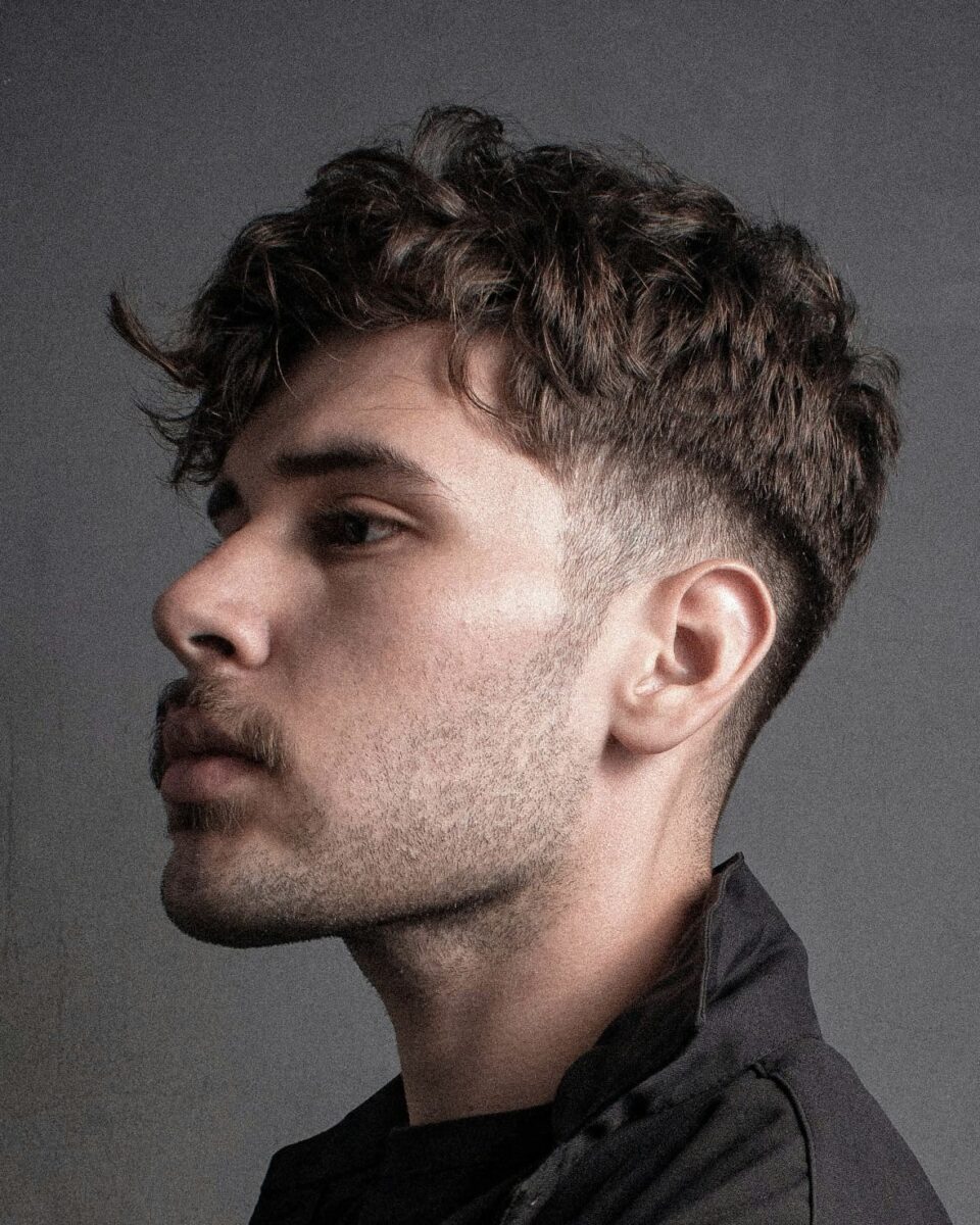 23. High Taper Fade with Curly Brushed-Up Fringe