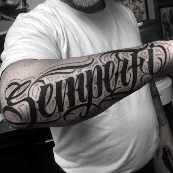 Lettering tattoos for men are quite popular for expressing phrases or ideas that are very meaningful to their owners. In addition to the literal meaning of the words of lettering tattoos, the font or script used to articulate the words can be an art form itself, giving tattoo artists the chance to truly express their creativity.