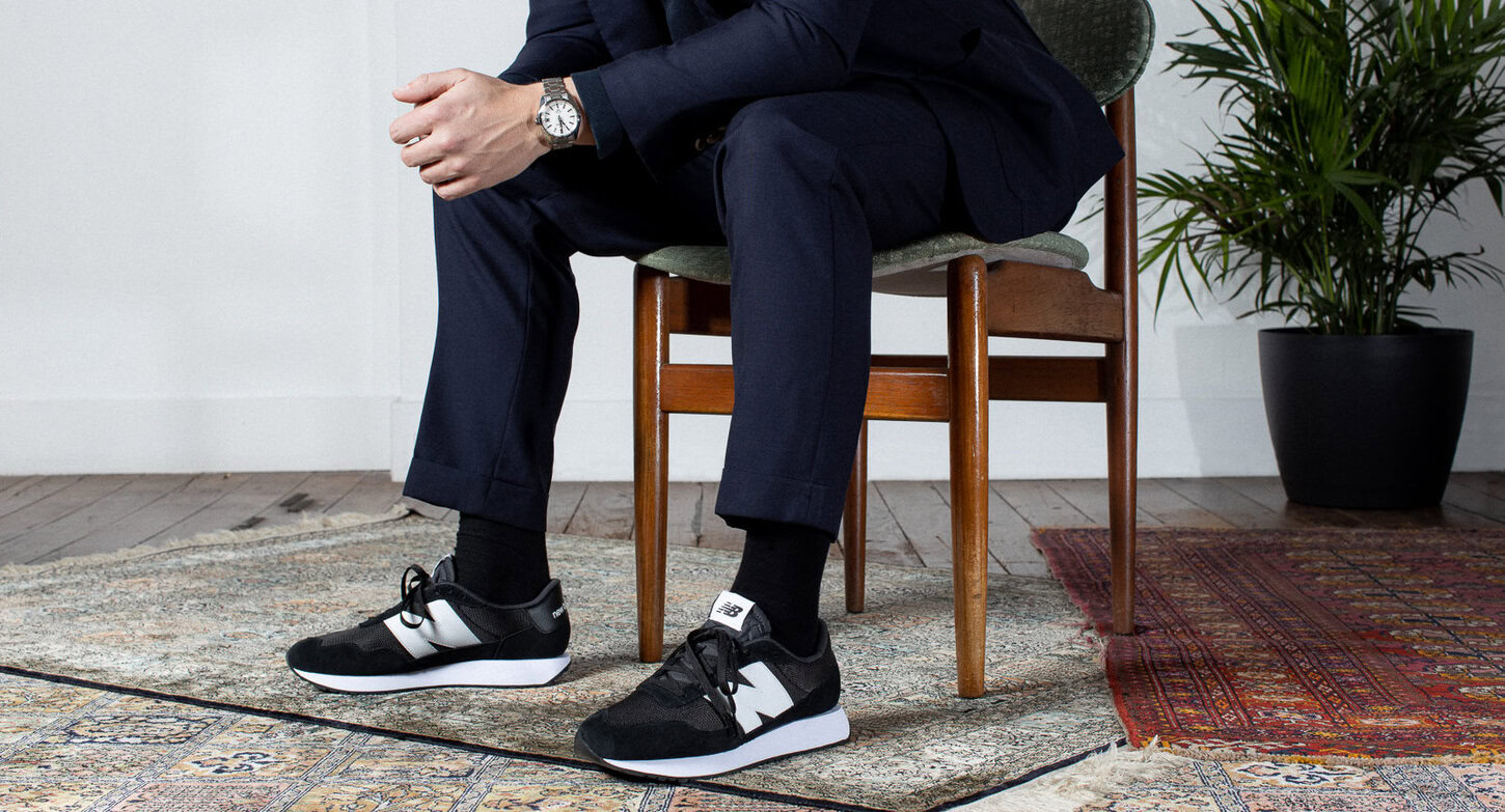 Reserved for the quietly confident, the suit with sneakers is a strategic and sophisticated choice that – when done right – speaks volumes of its wearer. Again, cloth texture is the key to success. Opt for linen or wool, like this Dugdale Brothers cloth, that provides excellent breathability in all seasons and versatility, in its ability to be worn as a suit (save the tie) or separated. Black 237’s are a subtle nod to a progressive style, not all will embrace.