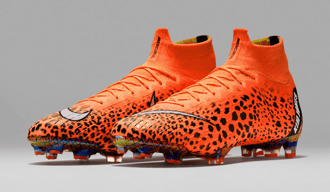 The result is a bright orange colourway adorned with black cheetah print that runs along the 360โs upper, with the Flyknit ankle construction remaining untouched. The boots are also finished with a contrasting white Swoosh and Kim Jones branding along the heel and sole unit, with the British designerโs logo beset by the eye-catching Mercurial โMโ on both the boots and custom box.