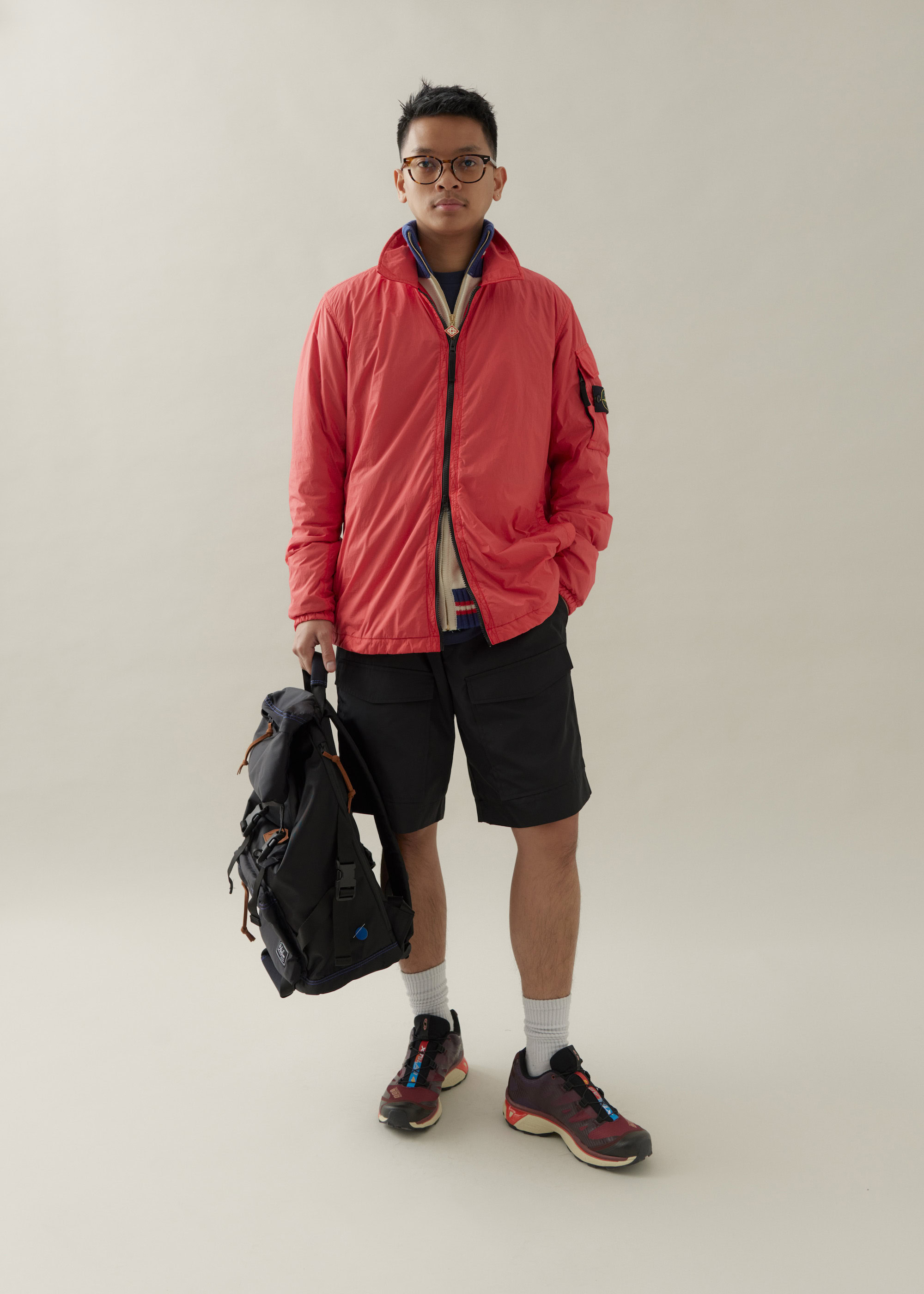 Next up: a slightly more dynamic look, pulled together by training shorts and Stone Islandโs signature โCrinkle Repsโ overshirt (in an impossible-to-miss red colourway). In this fit, weโre spotlighting the Salomon XT- 4 Sneakers โ an all-conditions model emblazoned with some very punchy details including the QuickPull lacing system and Salomonโs wildly specific โBitter Chocolar Mocha Mousseโ colourway.