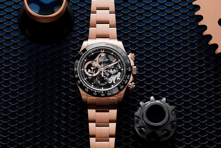 This Swiss creation is a limited edition timepiece with a skeletal dial that reveals the inner workings of the original watch, with the strap and watch face encased in solid 18k Everose gold with a matching gold rotor. A black ceramic bezel contrasts this gold to add a dark touch of class to the latest piece from these aftermarket wizards.