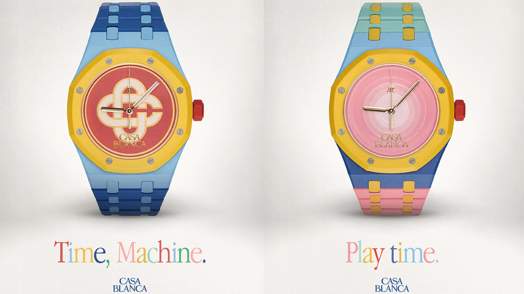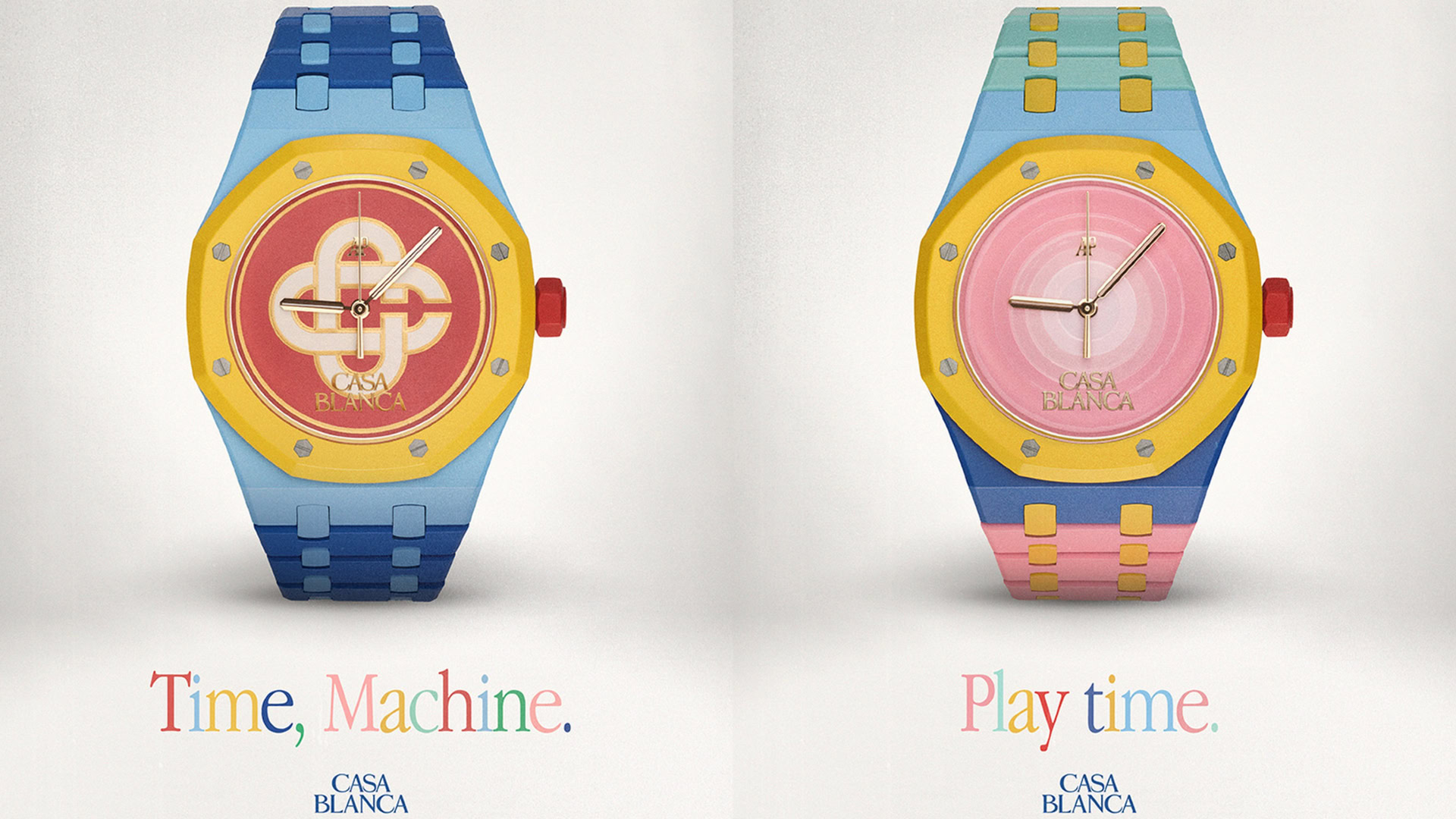 In contrast, Tajerโs design is reminiscent of the bold, block colours of the Memphis Milano movement from the 1980s. Using bright pastels across almost the entire watch, the different colours highlight various elements of the angular Royal Oak construction, as well as a pair of attractive dial designs.