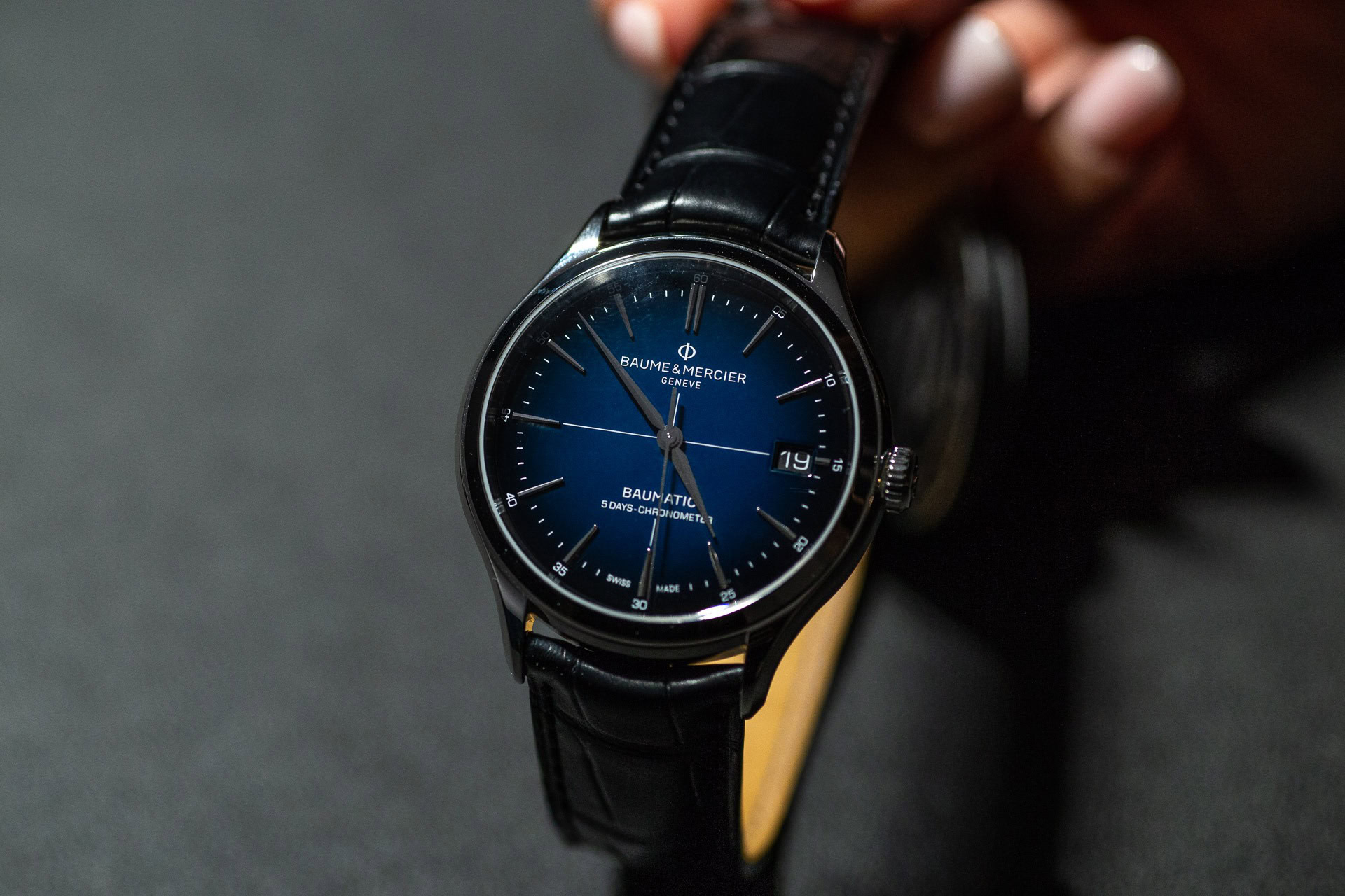 The Baumatic cadran bleu is available in two versions: one is mounted on an interchangeable black alligator leather strap with a pin buckle and one features a five-row steel bracelet with a triple folding clasp and security push-pieces which feels well constructed and sits harmoniously on the wrist. At โฌ2400, itโs an appealing entry into the world of Swiss watches.