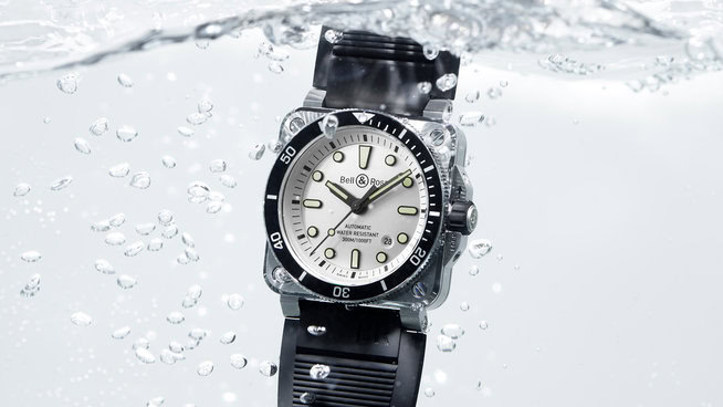 Inside, youโll find the automatic calibre BR-CAL.302, which runs at 28,800vph while offering just 38 hours of power reserve. The BR 03-92 Diver White arrives on one of Bell & Rossโs famously comfortable black rubber straps, as well as an additional resilient black synthetic fabric strap.