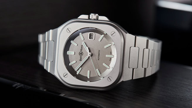 The first thing you notice about the Bell & Ross BR 05 Horolum is its light grey sandblasted case and bracelet. Measuring a very wearable 40mm across and executed in steel, it blends the time-honoured impression of an integrated bracelet sports watch, with the matte finishing of a stealth bomber. The case lines are softer and more rounded than you might find across the rest of the Bell & Ross catalogue, emphasising the urban interpretation of sporty chic.