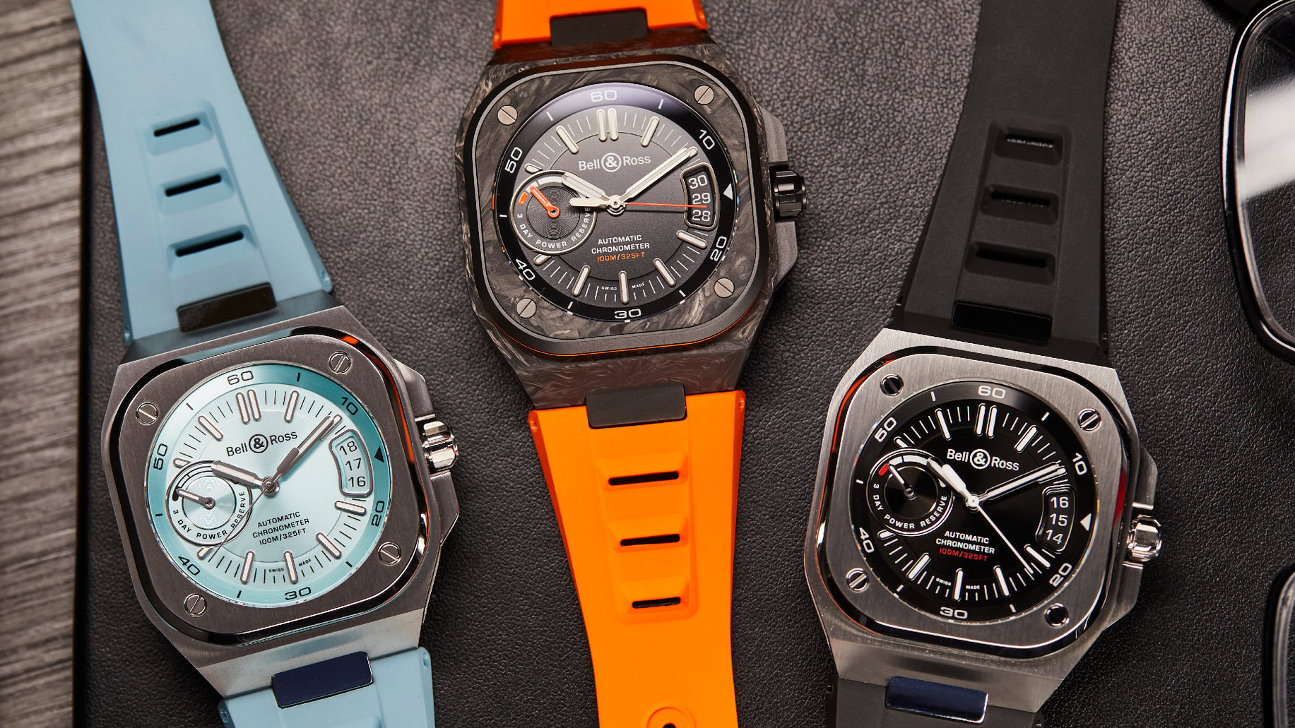 The first thing youโre struck by when you see the BR-X5 is the new dial layout, which is visually reminiscent of the BR-05 but has the additional complication of a power reserve indicator at 9 oโclock, and a larger date aperture at 3 oโclock. Bell & Ross has launched the BR-X5 in three different references, one of which is a sober black, another in a more summer sun-loving ice blue, and the final in dark carbon with orange highlights. The dials are a little busier than the clean look of the BR-05 but true to Bell & Rossโ focus on practical functionality, they prioritise legibility with a Super-LumiNova coating.