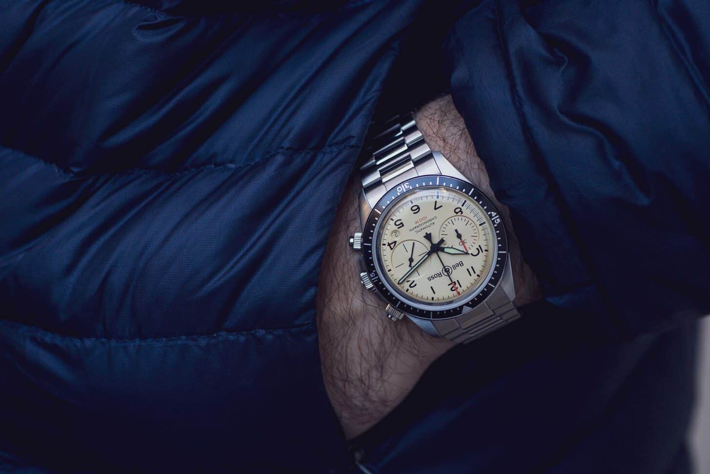 Aesthetically, thereโs a lot more to look at with the Chrono, so the 4.30 date window seems to fly under the radar a little more than the three-hand variant. Like the three-hander, it also boasts a domed crystal and sapphire case back, not that the movement has had much customisation to admire. Since seeing the V2-92 Aeronavale, Iโve considered the B&R bracelet a triumph and on this V2-94, itโs even better. Itโs sturdy yet elegant and adds to the versatility of the over package, which looks excellent worn casually or with a suit.