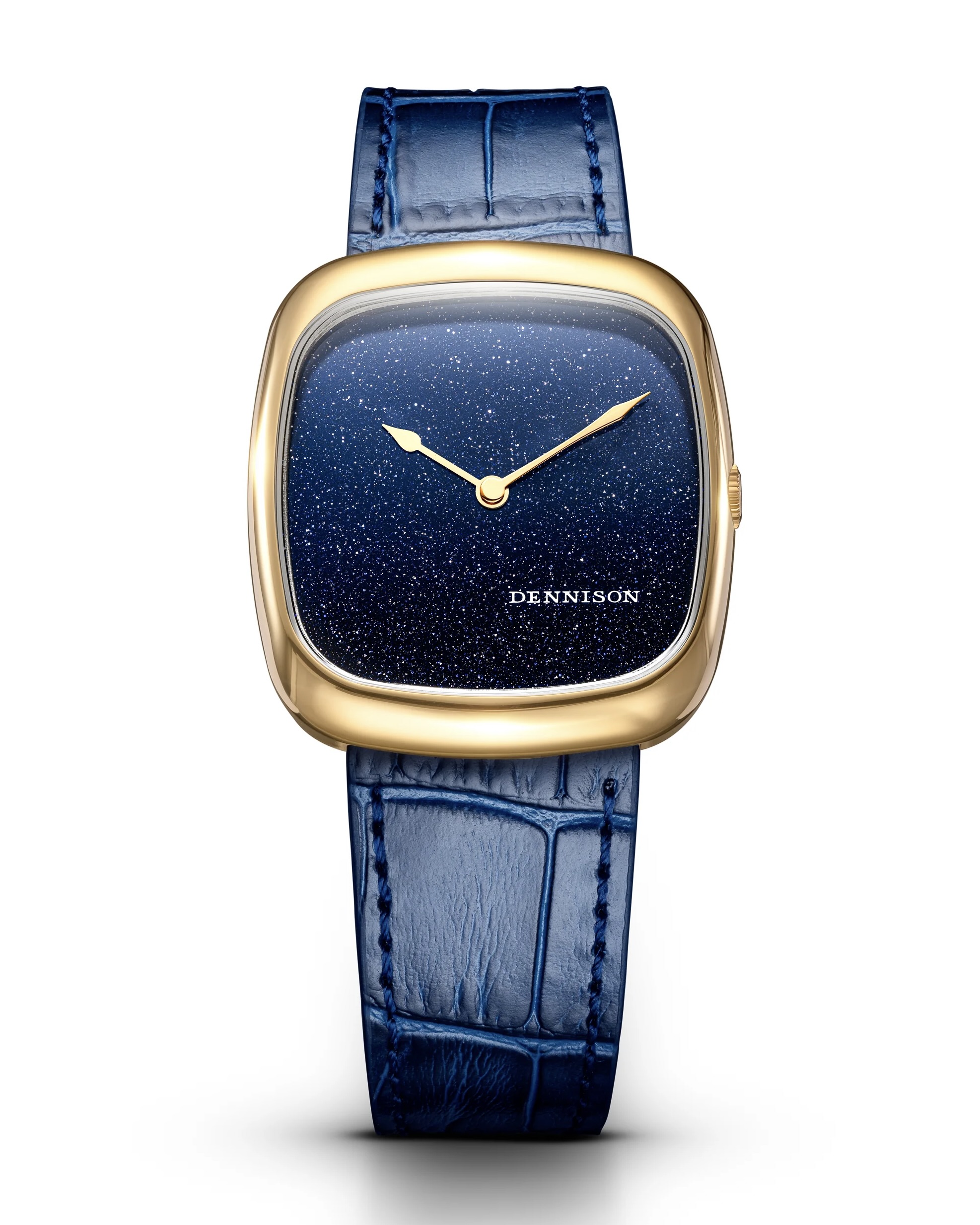 This cushion case option from Dennison is wafer-like at 6mm thick, with a gold PVD treatment and an Aventurine glass dial that makes it look like the price is missing a zero.