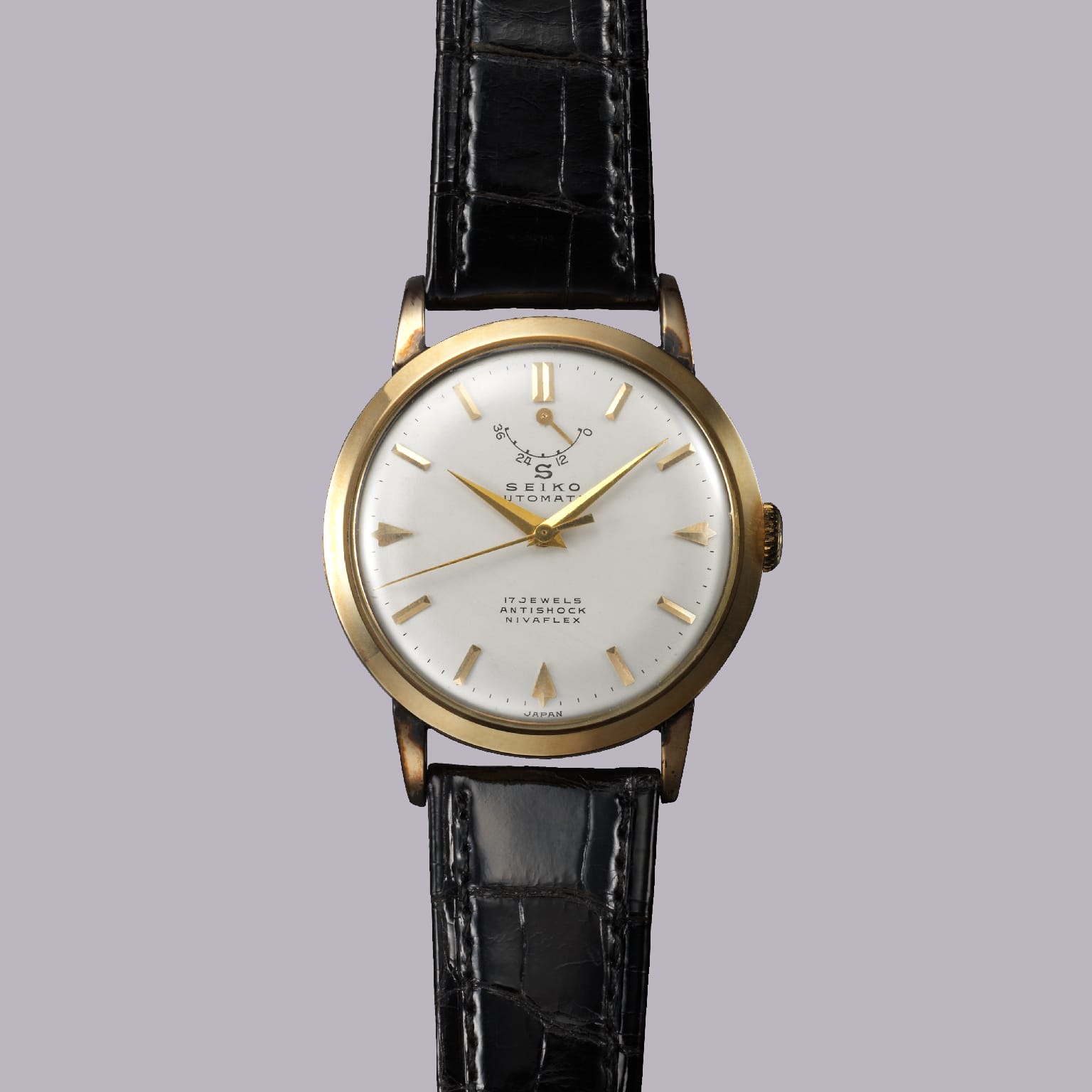 Another relatively rare and important Seiko from the history books is the very first automatic watch released by the watch manufacturer, launched in 1956 (just three years after Patek Philippeโs first automatic calibre made its debut). Featuring a gold-filled case (similar to gold-plated), its hour markers are brilliantly three-dimensional, and it arrived with a power reserve indicator at the 12 oโclock position just above the logo.