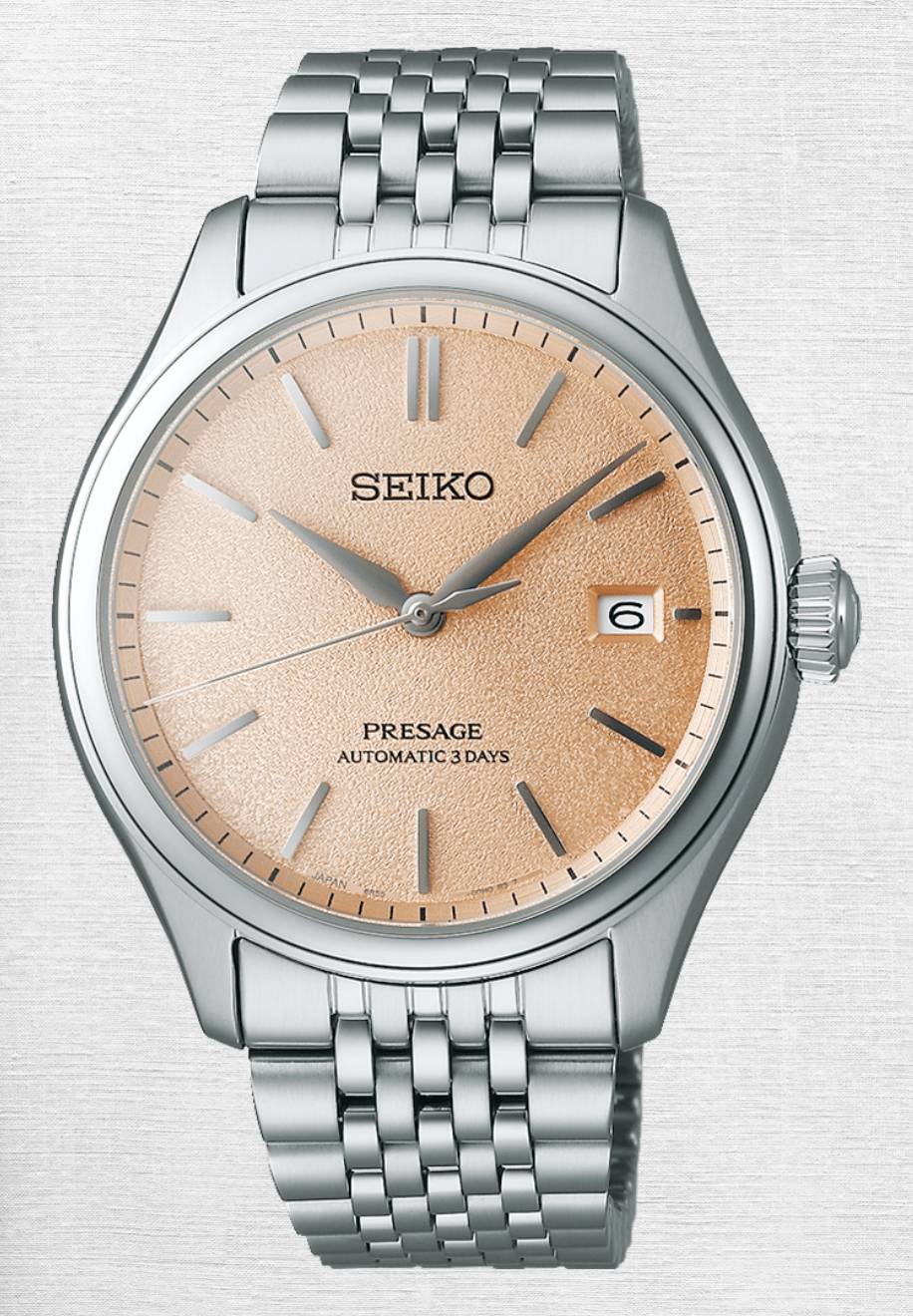 One of the most recent additions to the Presage collection is this charming Seiko SPB467, which arrives with an almost universally wearable 40.2mm stainless steel case and comfortable steel bracelet. The star of the show, however, is the textured salmon-tone dial, which brings a touch of warmth to a collection that is otherwise known for its more traditionally finished dials.