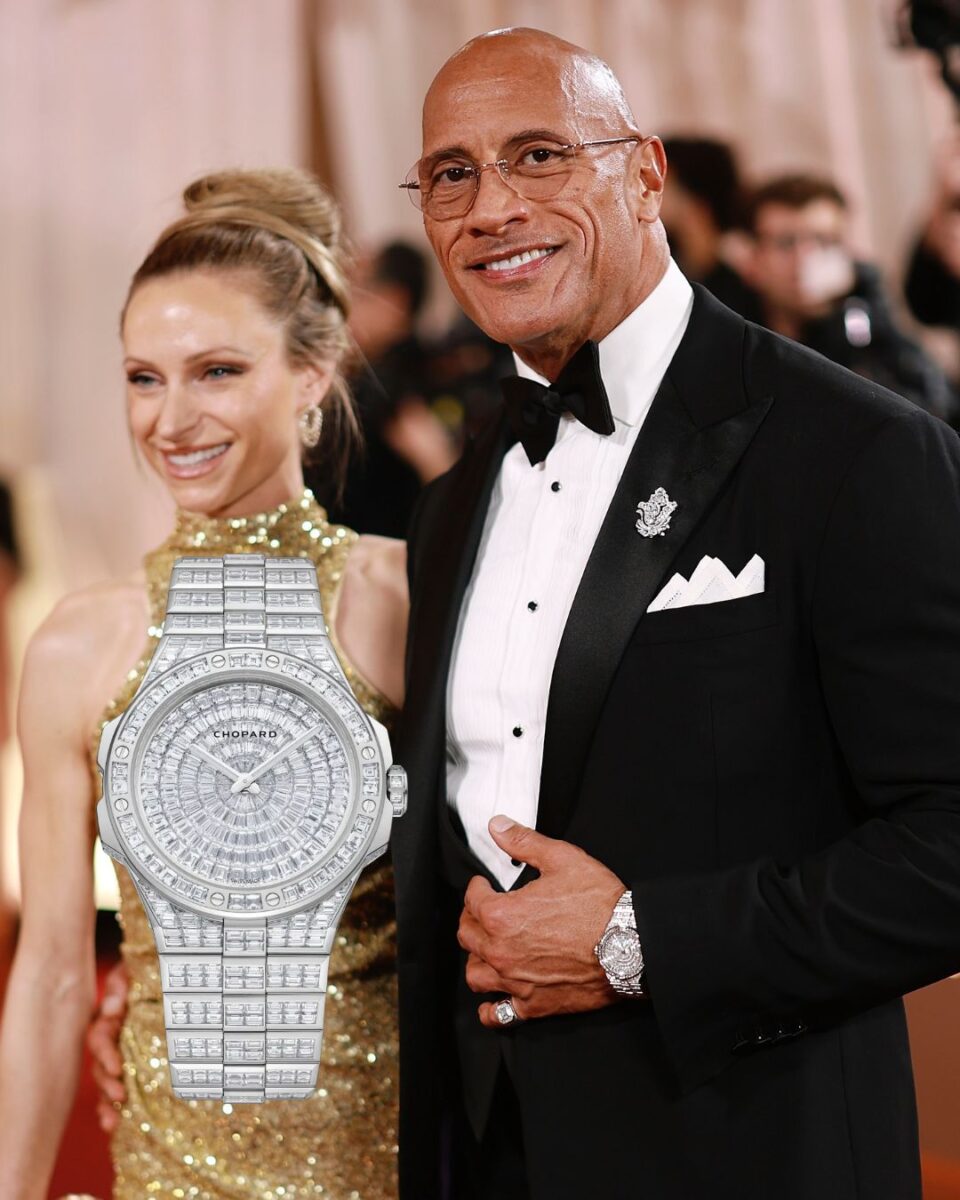 The Rock by name, big rocks by nature, it would seem, as Dwayne Johnson was seen wearing the fully baguette-cut diamond set Chopard Alpine Eagle 41 Frozen Summit. Considering its 41mm case size, it almost looked small on his massive wrist, but paired very nicely with an equally diamond-encrusted lapel brooch.
