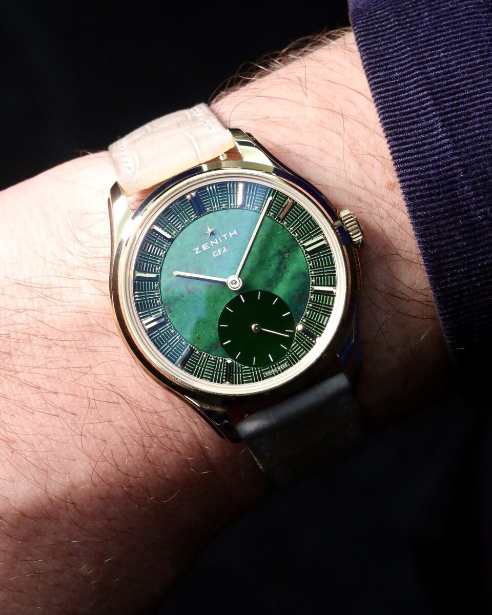 While plenty of deserved attention goes to Zenith’s chronograph line-up, the watchmaker’s G.F.J. collection is quietly one of its most beautiful timepieces. This year, we’ve got a new version with a green-flecked bloodstone dial and a 39.5mm yellow gold case, powered by the Calibre 135 that was originally developed in the late 40s for timing competitions.