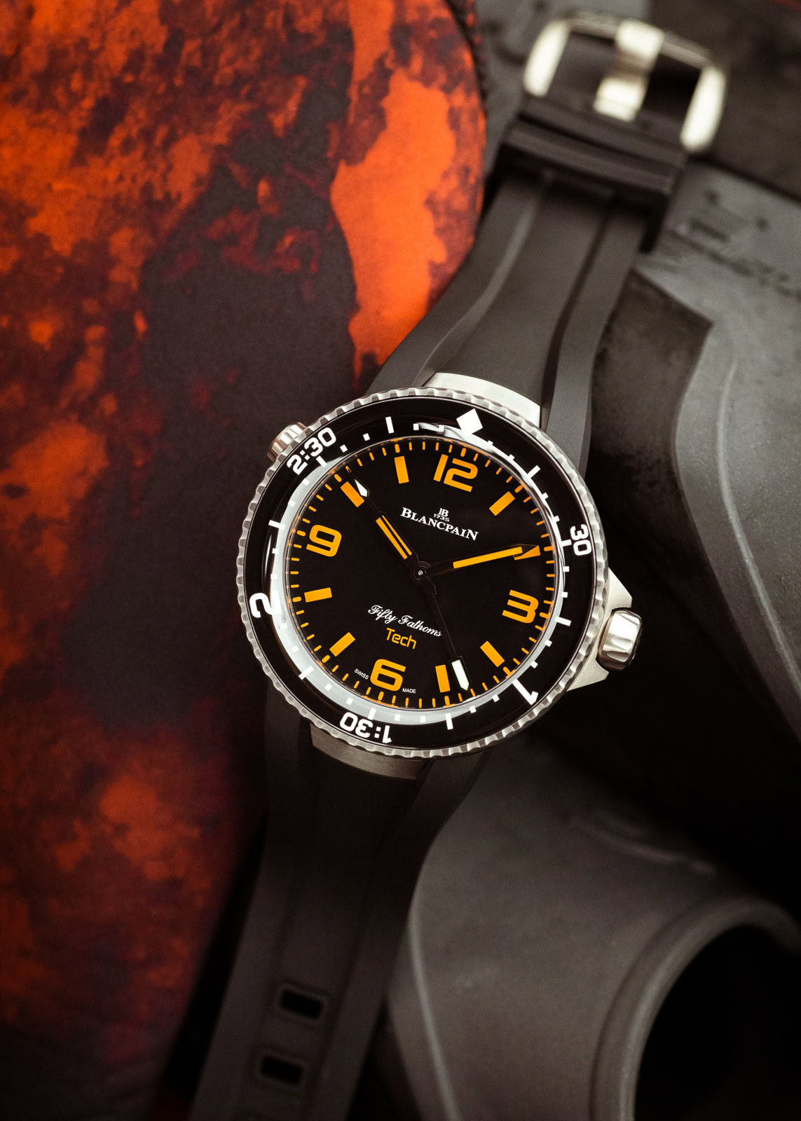 Undoubtedly, the dial and bezel are where the Tech’s idiosyncrasies shine most brightly. Jointly the subject of a new Blancpain patent, the bezel (alongside a corresponding hand in luminescent white material) allows its wearer to measure technical dives lasting up to three hours. The ceramic timing scale – etched with numerical markings, each in 30-minute intervals – is colour-matched to the corresponding hand on the dial; and these are given significant contrast with the main time display, lumed in a shade of blue-tinted orange that is all but unmissable.