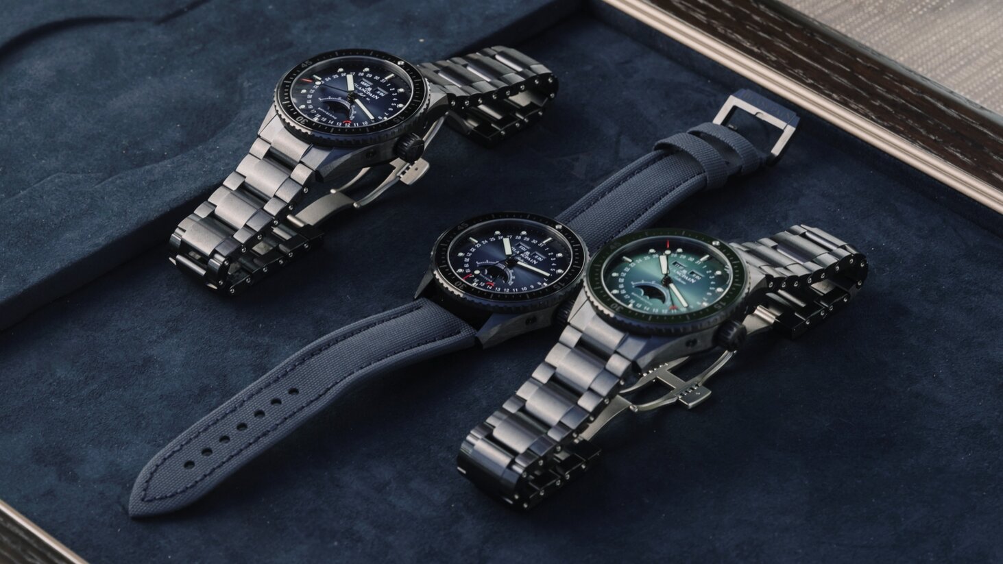 Perfectly in keeping with the launchโs Hayman Island setting, the Bathyscaphe models we went hands-on with were kitted out with blue or green dials. In the past, this is an aesthetic element that Blancpain has iterated on extremely well.