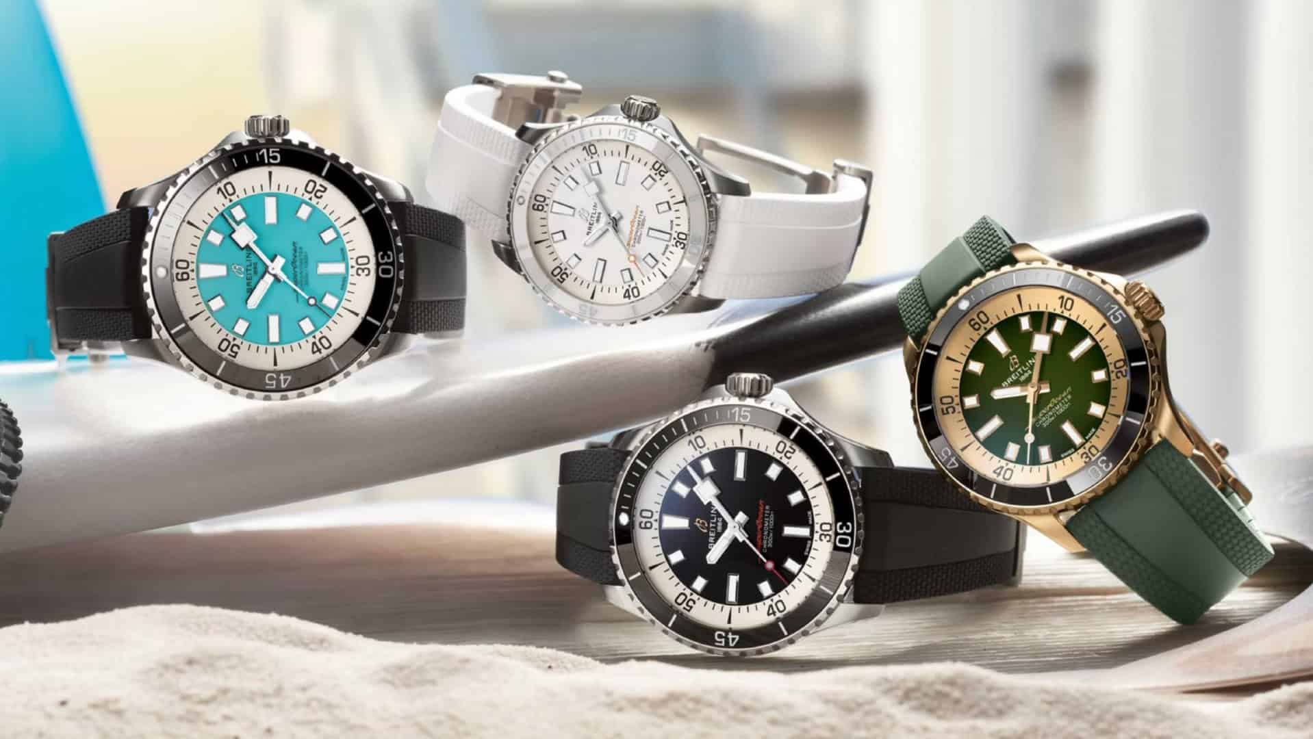 The new Breitling SuperOcean collection includes 36mm, 42mm, 44mm, and 46mm sizes, with the majority in steel, but two references in bronze and a third two-tone reference in steel and red gold. In addition to the something-for-everyone sizing and materials, the watches are also available in black, orange, navy blue, green, aquamarine, brown and white, meaning youโll always be able to match your SuperOcean with your outfit.