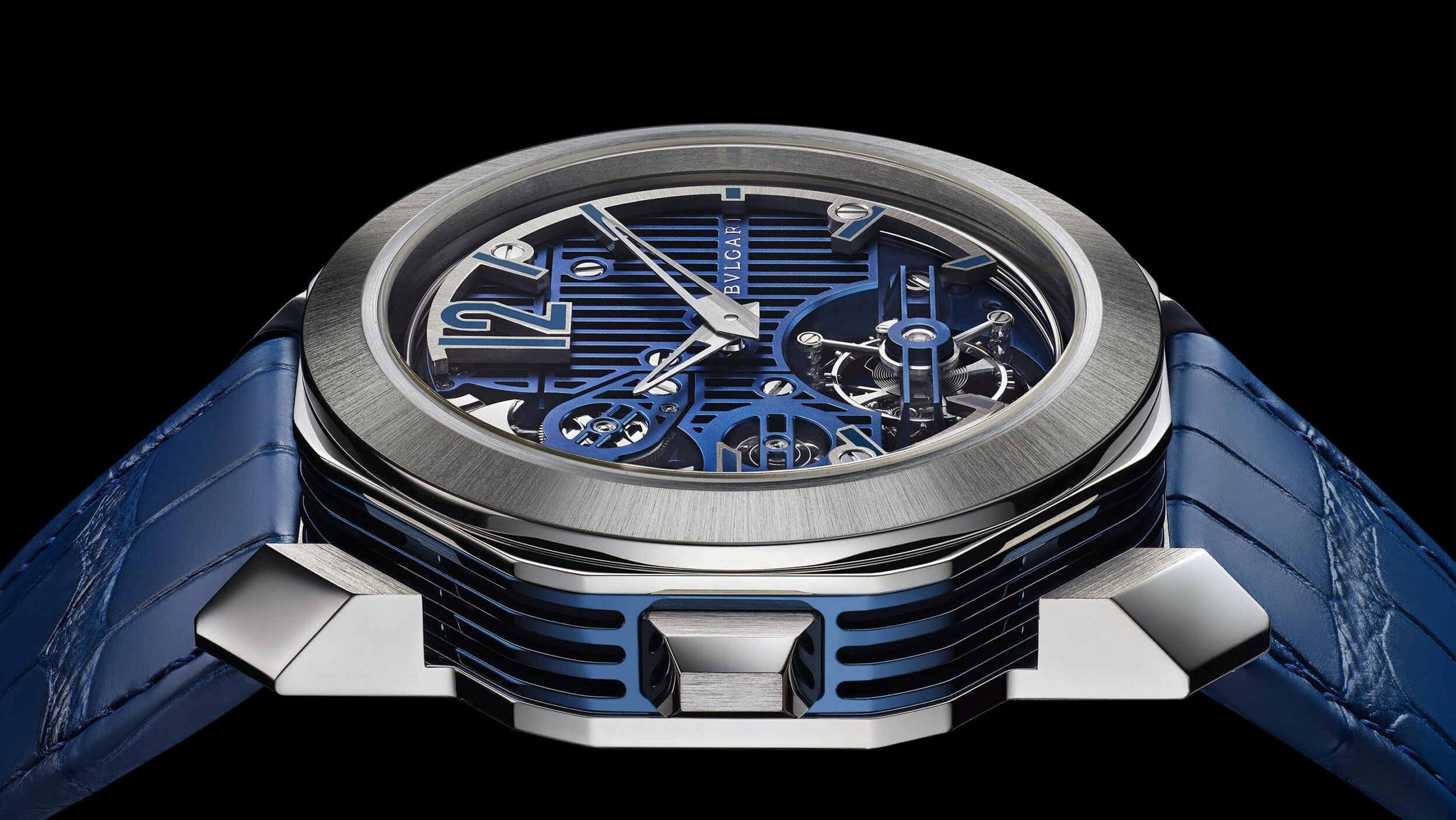 Featuring a 44mm platinum case with a thickness of 12.83mm, the blued case middle is made from titanium and contains a number of cleverly designed apertures (which we also see on the dial). Why would Bulgari make a case with holes in it? As you might imagine, this isnโt a watch designed for deep diving, instead, the apertures help with the amplification of the chiming mechanism within the watch.