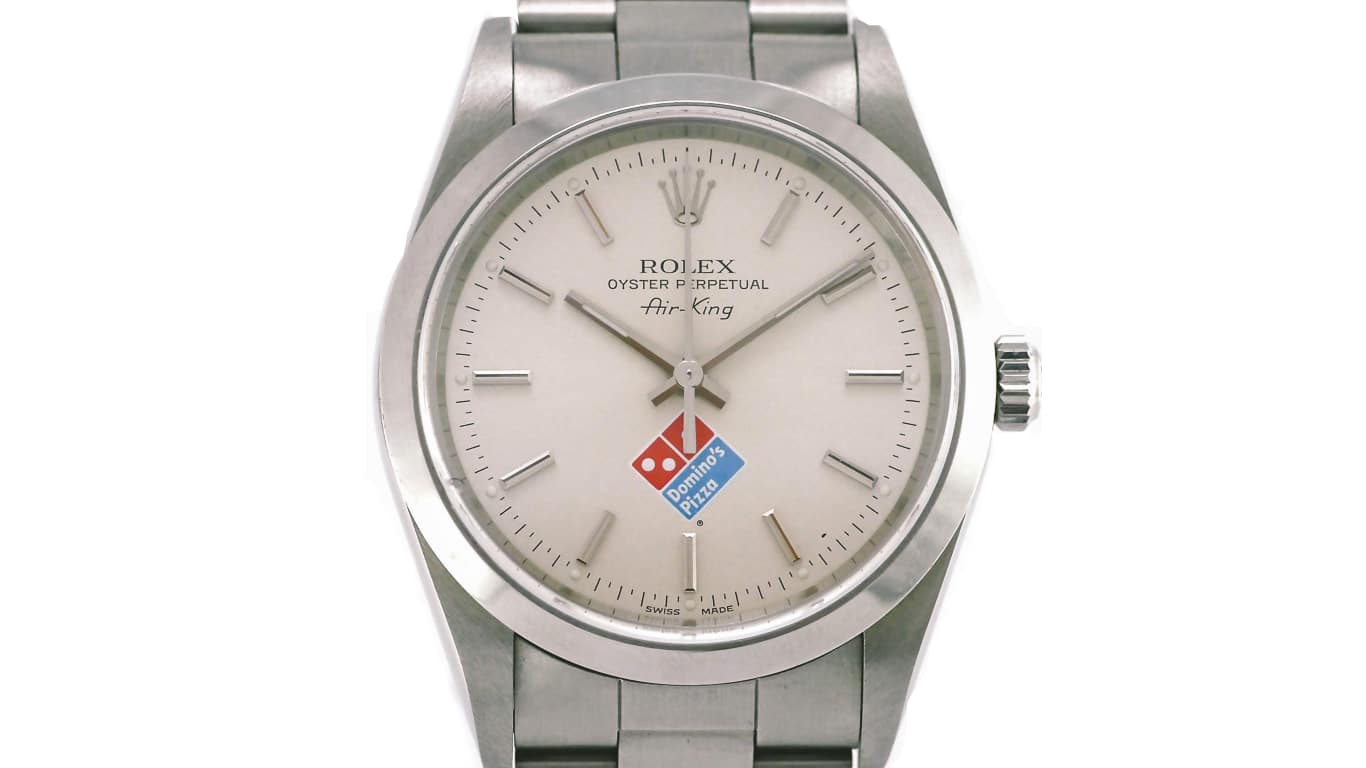 It didnโt take long before Monaghan upped the ante by instituting the official โRolex Challengeโ. US$20,000 in sales accomplished within a single week would earn you a silver Rolex Air-King, complete with Dominoโs branding on both the face and band.