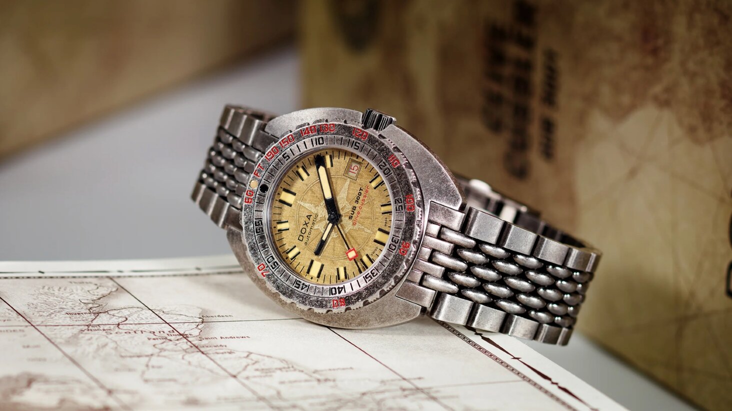 The dial has also been updated from the typically brightly coloured tones of Doxaโs dive watches, now featuring an aged parchment-like compass design that adds to its treasure-hunting mystique. Other charming details include the red printed dates of seven, 15, and 31 to honour Cusslerโs birthday (the 15th of July, 1931) and the caseback that features the names of the 72 shipwrecks that Cusslerโs National Underwater and Marine Agency (NUMA) have found over the decades. Appropriately, some of the proceeds of this watch will be given to NUMA to continue its underwater exploration.