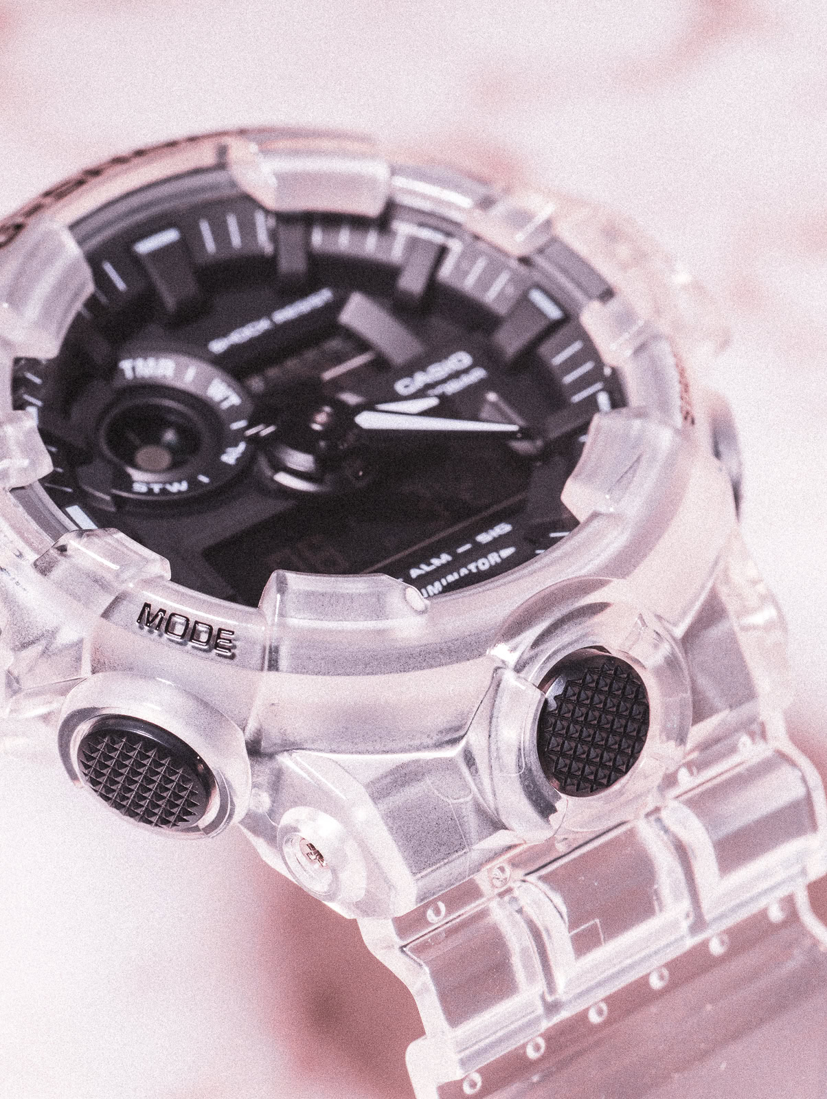 The series obviously follows last yearโs semi-translucent anniversary-edition G-Shock DW6900, which was similarly remixed in a resin case and band, with polarising gradation on the glass that changed colour as a function of viewing angle.