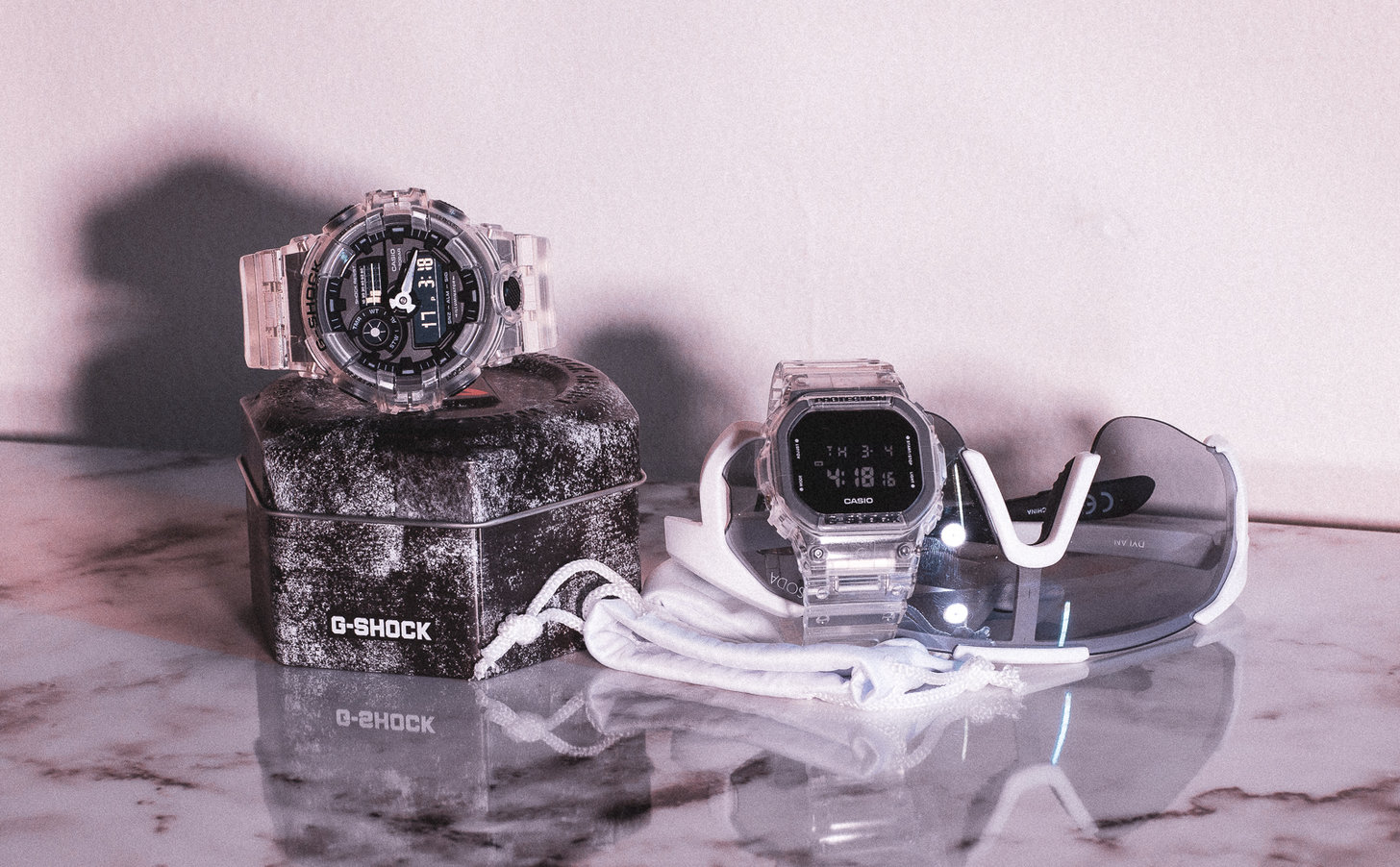 The series obviously follows last yearโs semi-translucent anniversary-edition G-Shock DW6900, which was similarly remixed in a resin case and band, with polarising gradation on the glass that changed colour as a function of viewing angle.