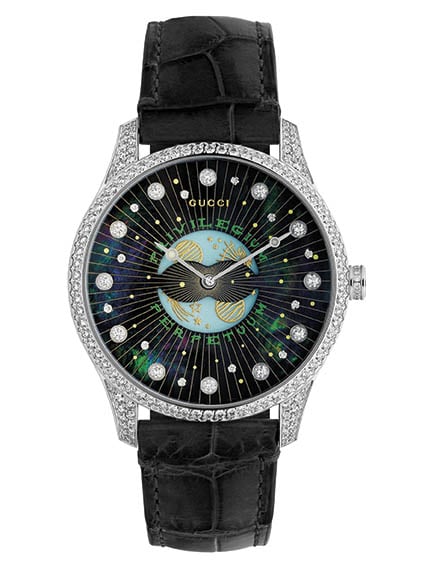 The G-Timeless series offers a touch more personality for those that appreciate the intricacies of Gucciโs creative direction. Of these, the โdancing beesโ timepiece features small bees on the dial that actually swing and shimmer when the watch moves on the wrist. A more colourful moonphase with white diamonds is also offered on an alligator strap, and the Dancing Bees watch can also be purchased with a tourbillon movement if desired.