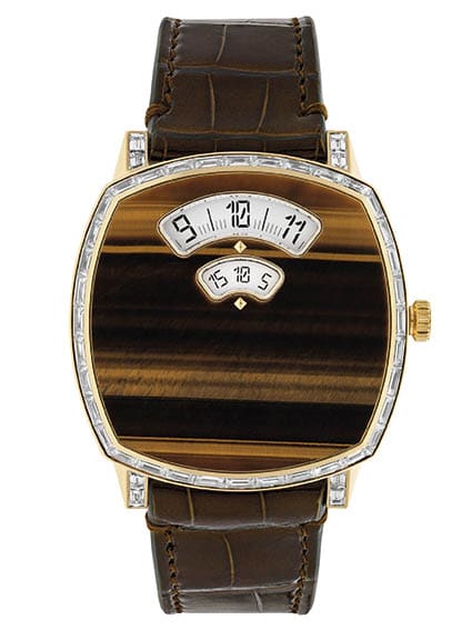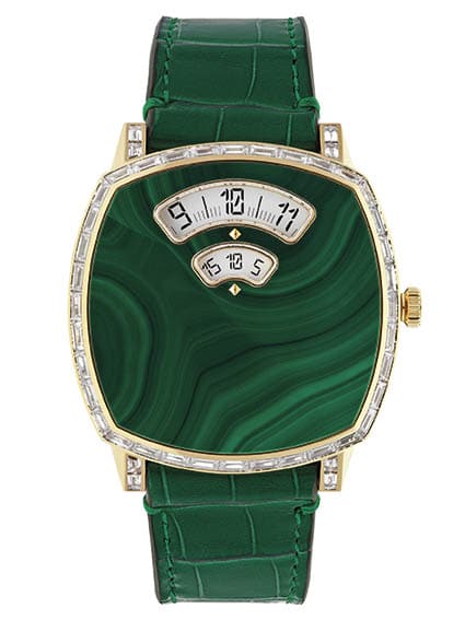 Gucciโs dramatic entrance to the high watchmaking game in 2021 doesnโt stop there, with another five watches joining the collection under the โGripโ line. Each of the watches vary in aesthetic but boast a Jump Hour movement thatโs primed to โjumpโ forward every hour, as well as a minutes disc that sweeps around through 60 minutes. The clean numerical display sits on gorgeous hardstone dials for three of the watches โ each cut by a precision gemstone cutter who had to balance strength with the unique design shape.