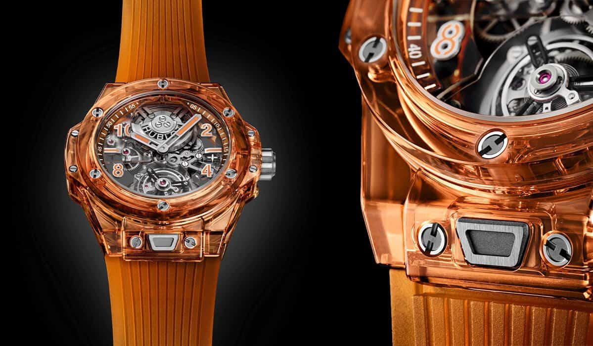 Entirely designed and manufactured in-house, the Big Bang Tourbillon Automatic Orange Sapphire follows in the footsteps of the Big Bang Unico Sapphire, All Black Sapphire, and Big Bang Red, Yellow, and Blue Sapphire editions โ in that it is a dramatically transparent timepiece giving wearers (and admirers) complete visual access to all the sophisticated mechanics inside. This is complemented by the technical tone of the six H-shape titanium screws that typify the Big Bang.